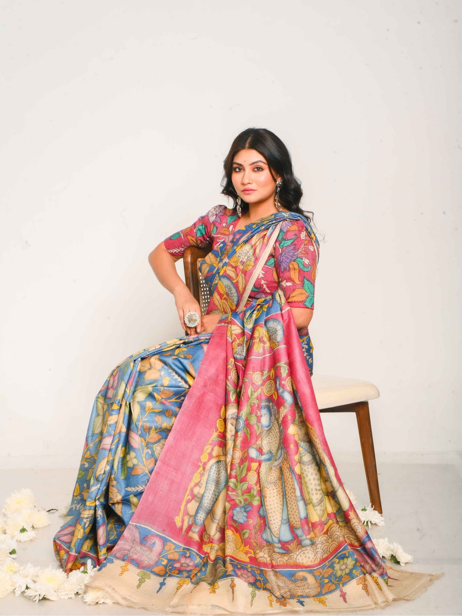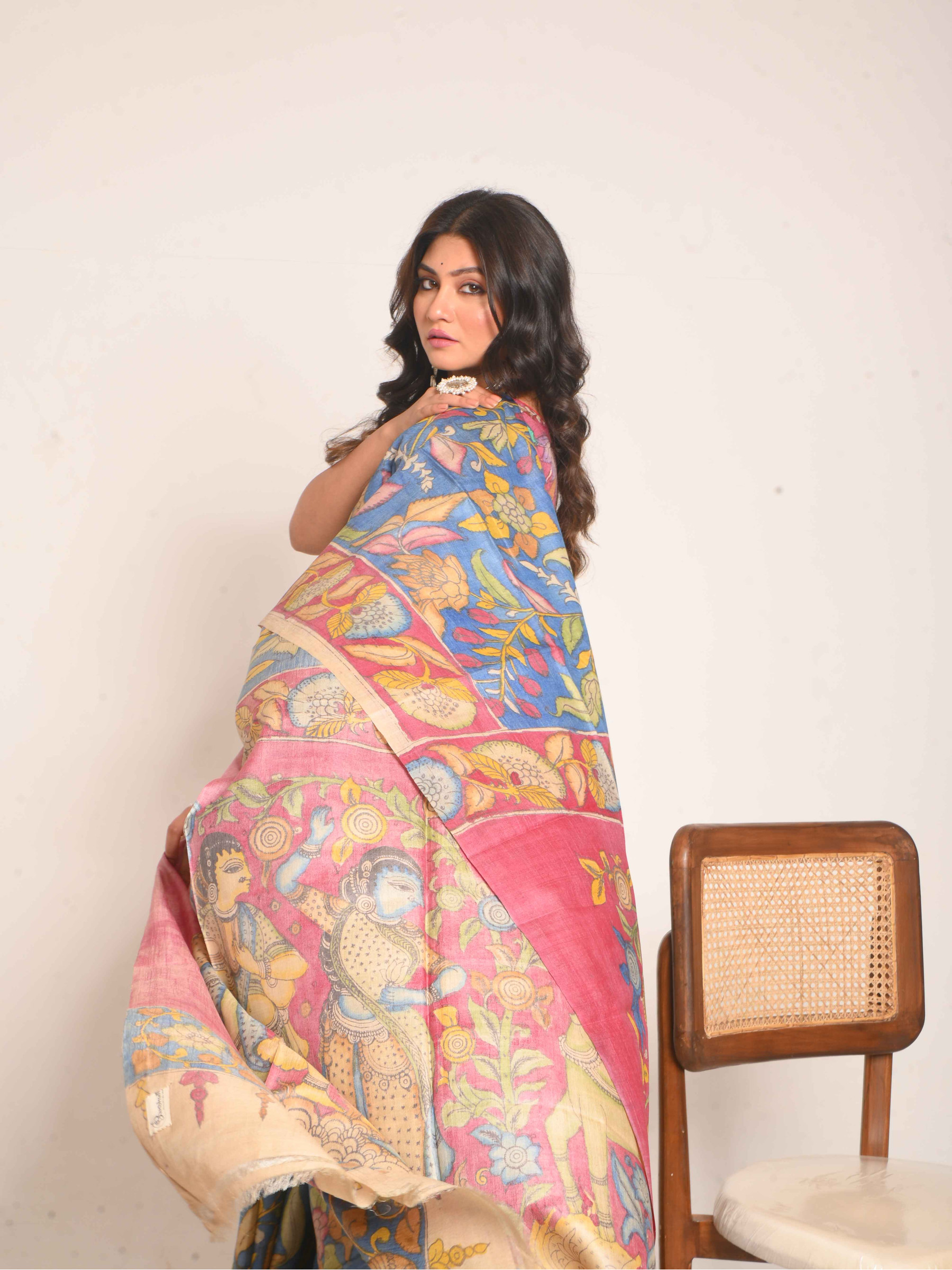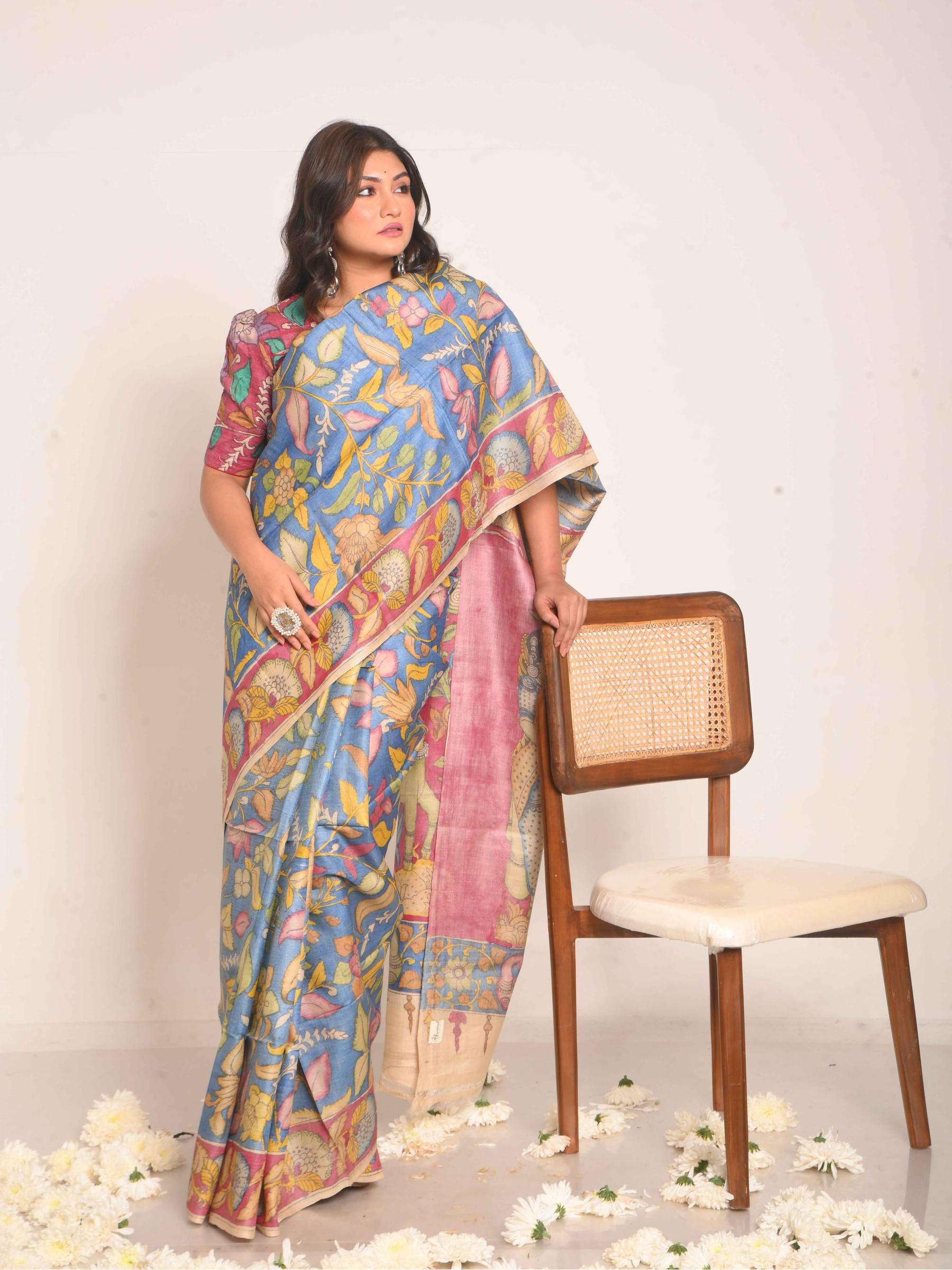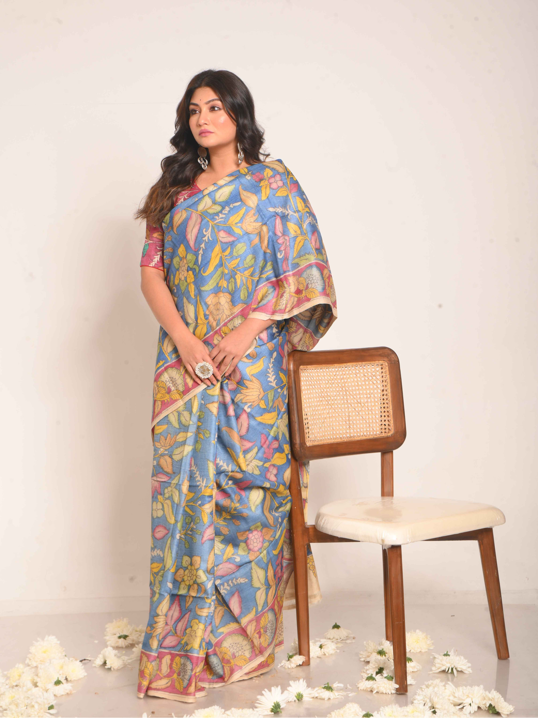 Hand Paint: Blue Color Kalamkari Tussar Silk Saree