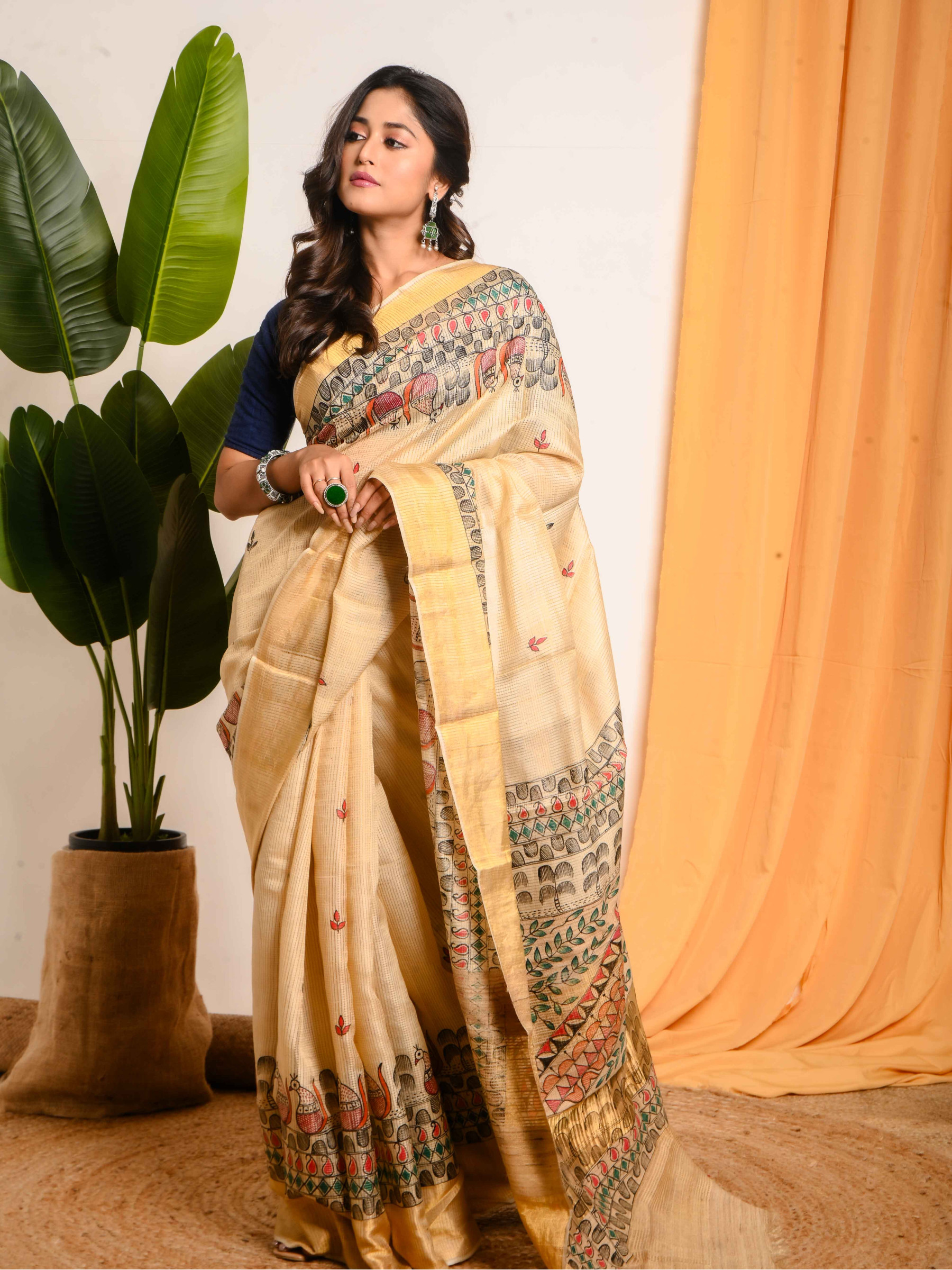 Dipsha draped herself in a Madhubani hand-painted Tussar saree from Bandhuli, bathed in calming shades of beige. Each brushstroke whispered tales of Mithila’s heritage, flowing effortlessly with her grace. Against the lens, art met emotion—tradition met modernity. Her exclusive photoshoot became a quiet celebration of craftsmanship, where Dipsha didn’t just wear a saree, she carried a living story of India’s timeless soul.