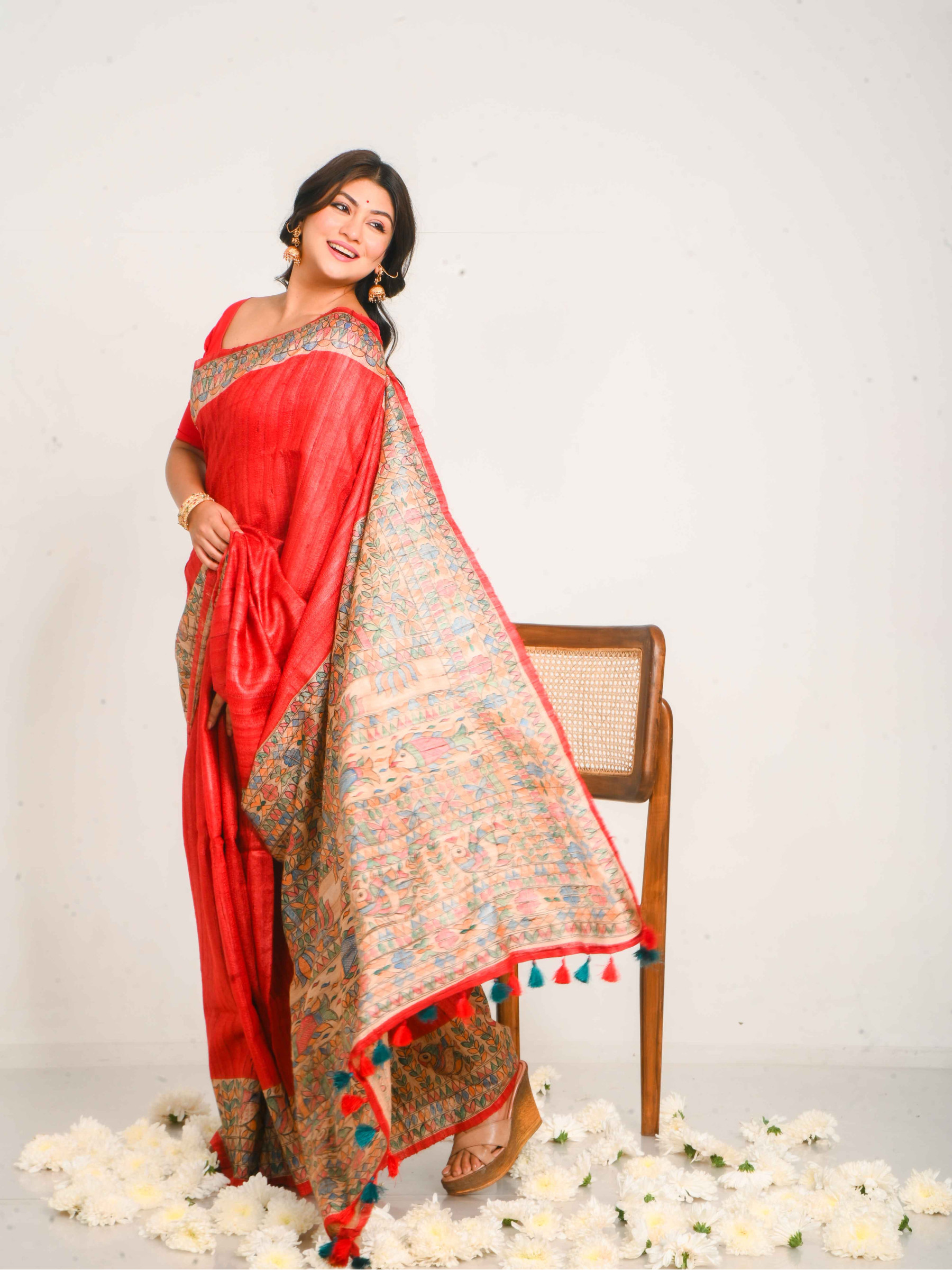 Koyel embraced elegance in a Madhubani hand-painted Tussar saree from Bandhuli, rendered in striking shades of red. Each intricate motif stood bold, narrating stories of heritage and strength. Before the camera, tradition transformed into contemporary grace. Her exclusive photoshoot captured a powerful dialogue between art and silhouette, where Koyel became the muse and the saree, a timeless expression of Indian craftsmanship.