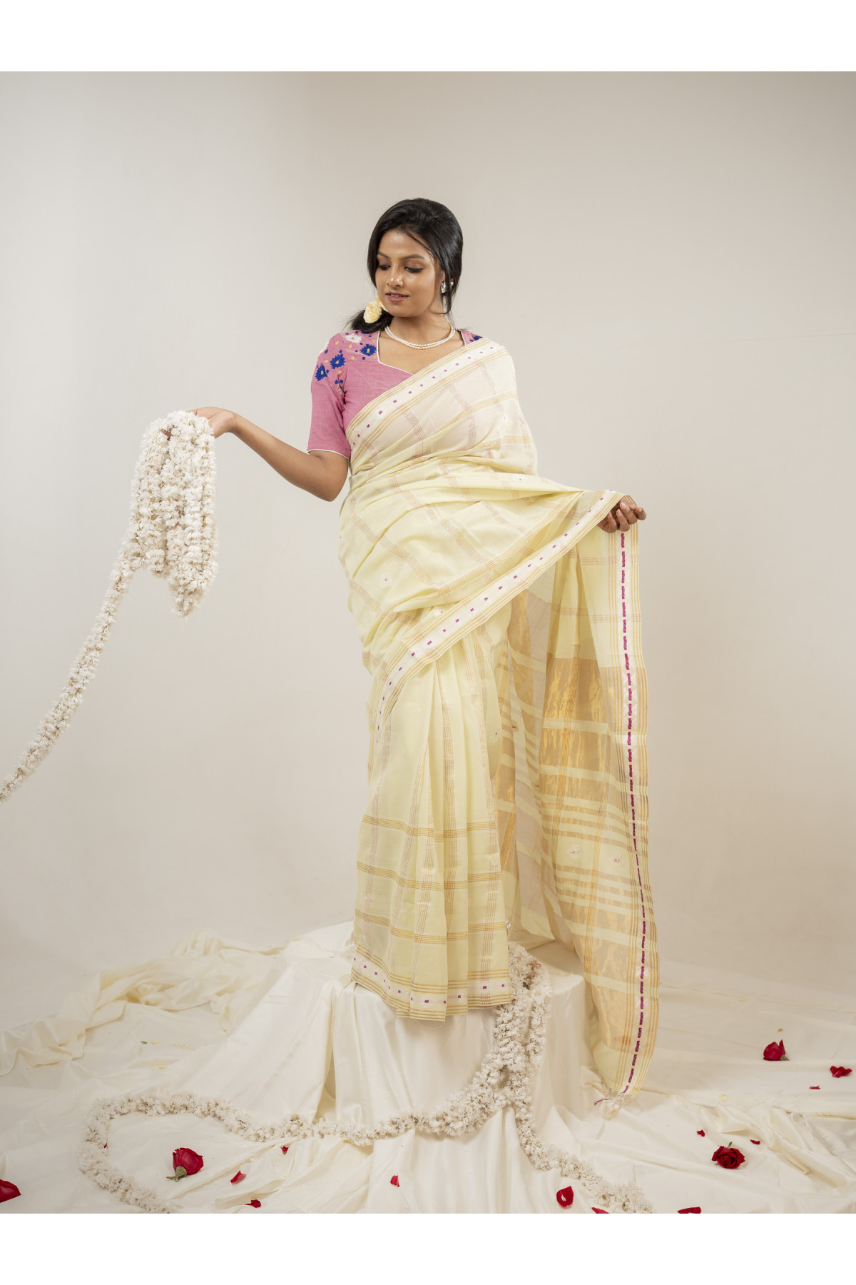The Shiuli Collection by Bandhuli reinterprets the poetry of tradition through a contemporary lens. Rooted in Jamdani, classic butis are translated into a modern composition of structured stripes and delicate zari lines—creating a rhythm that feels both timeless and new.
