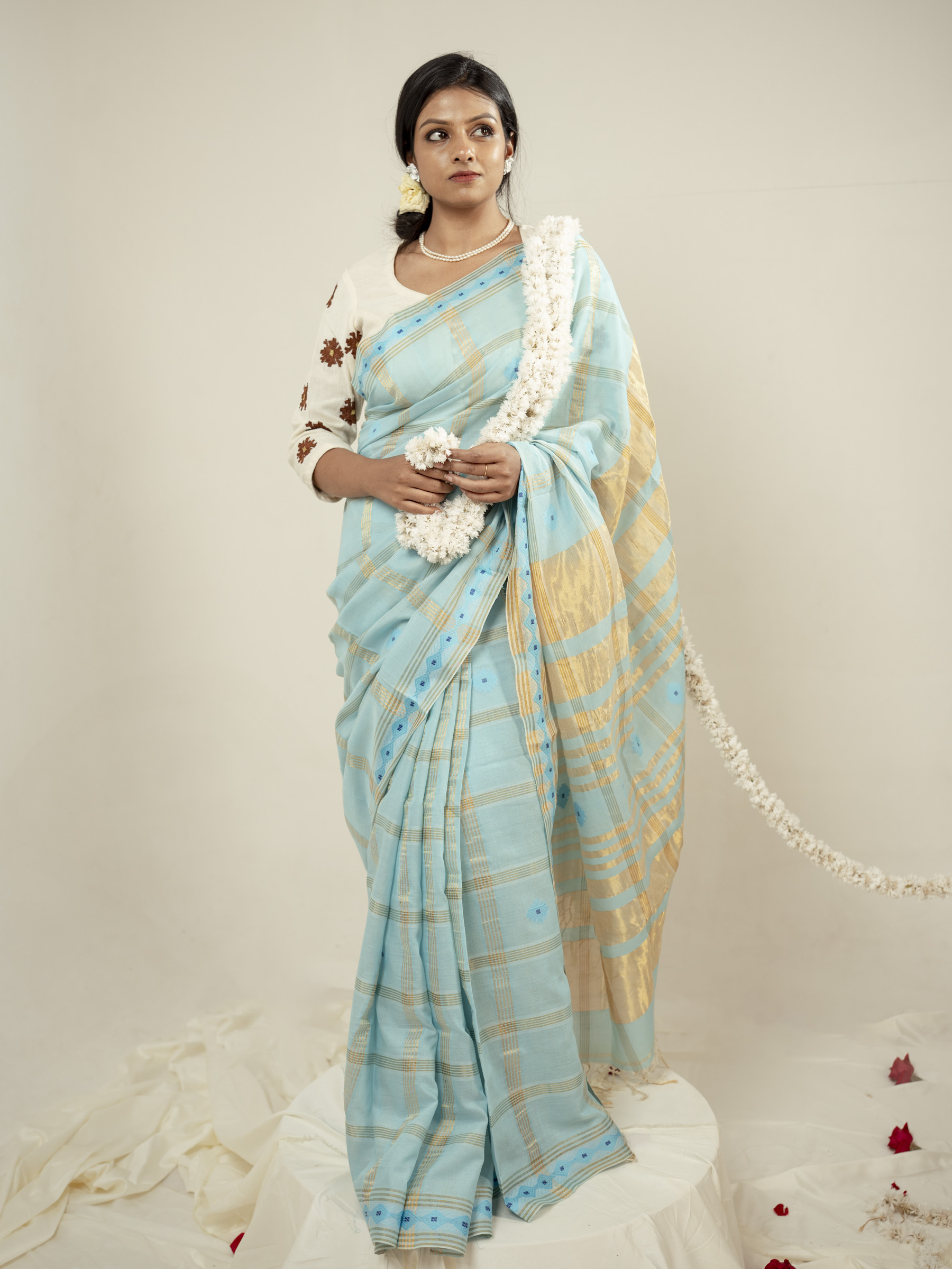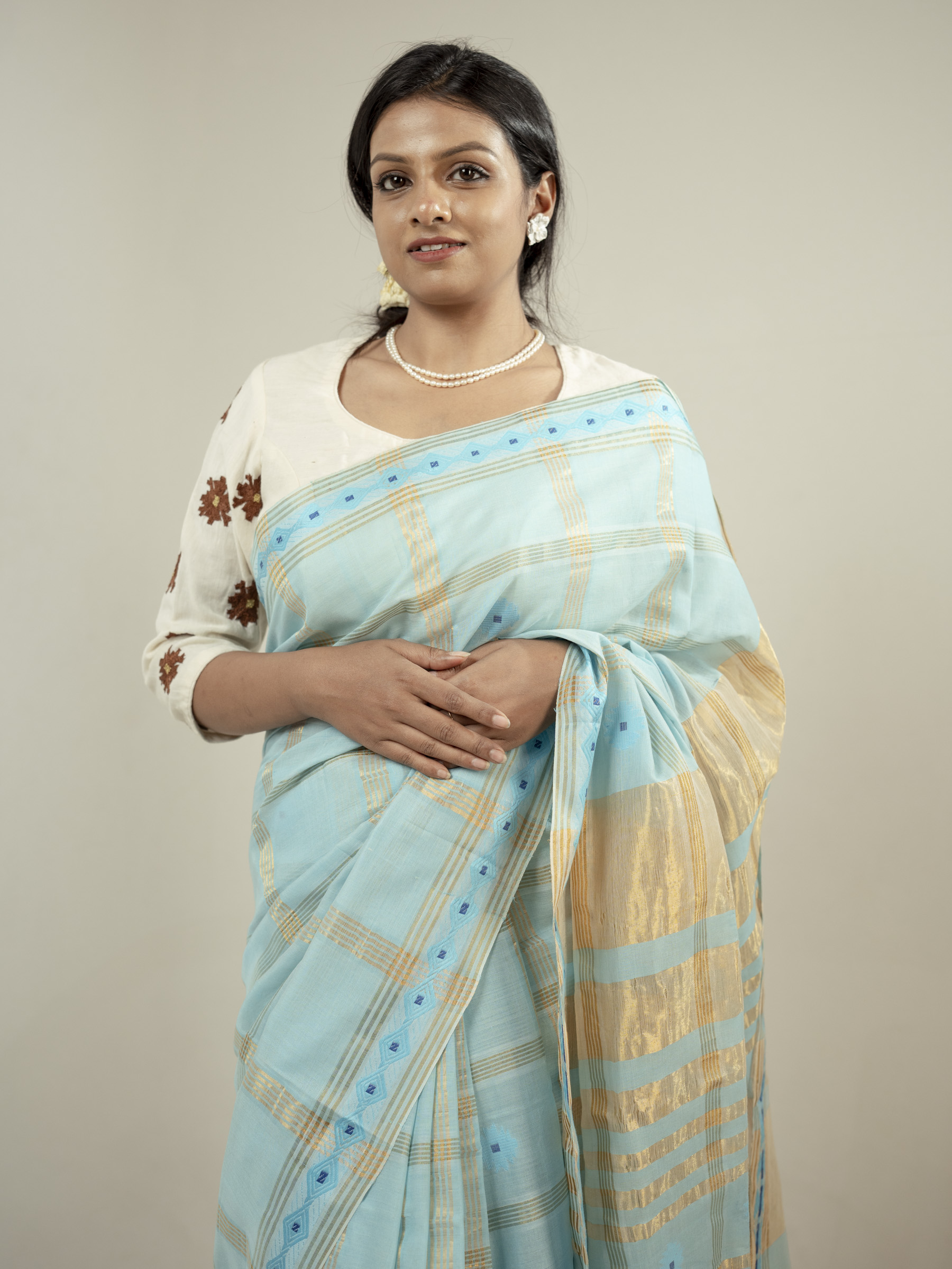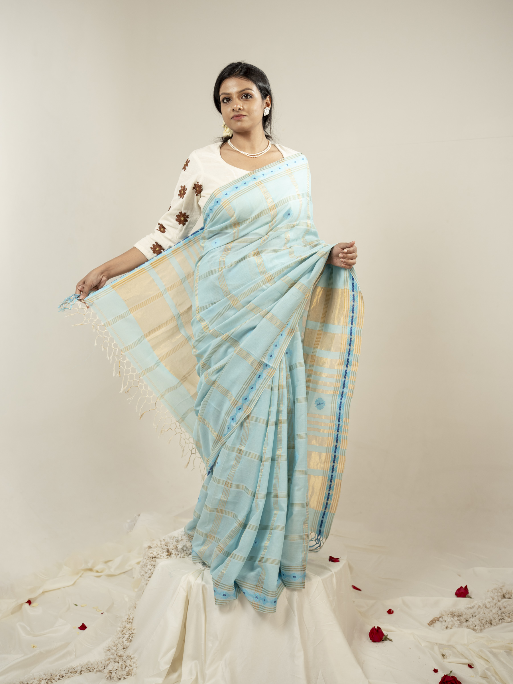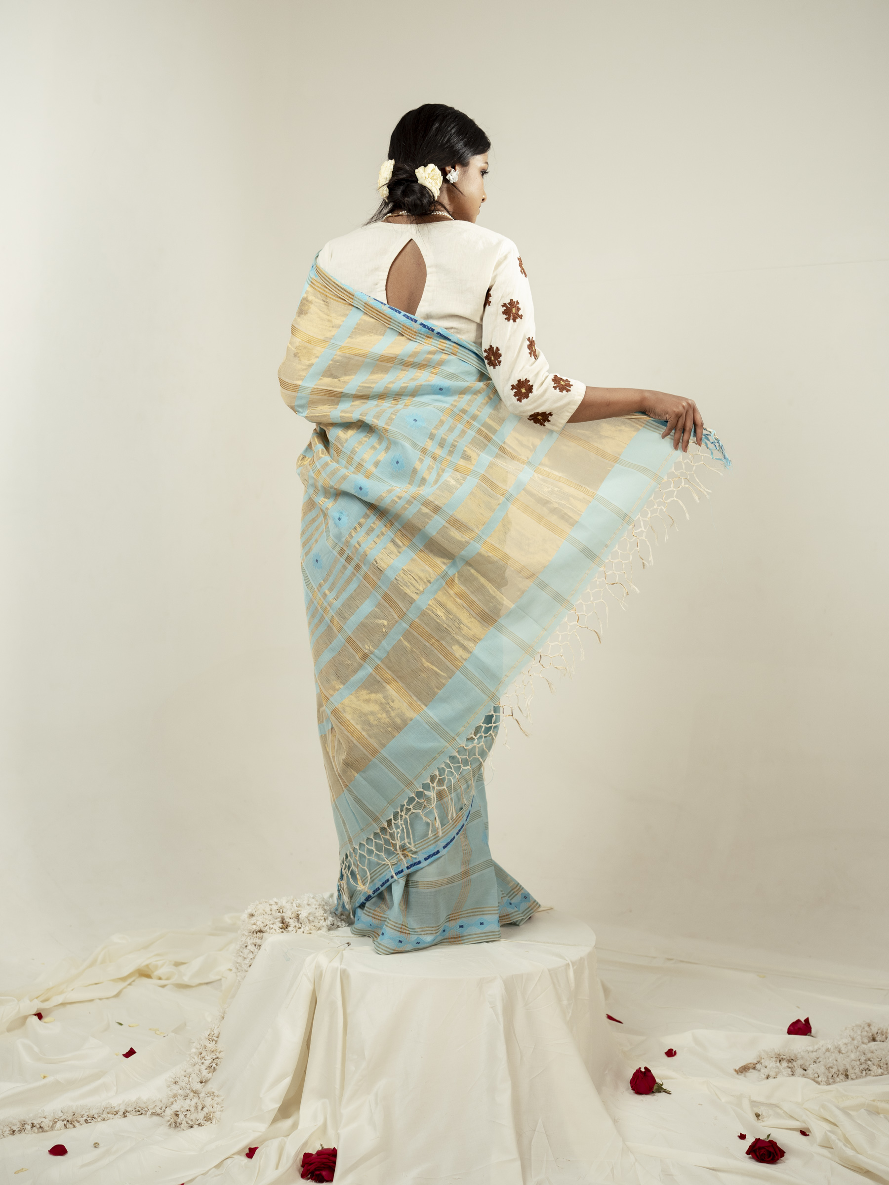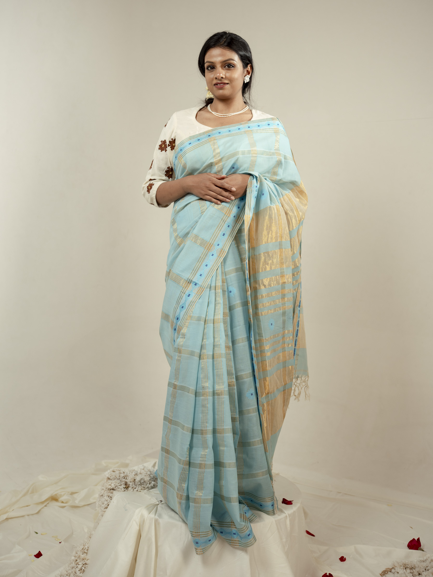 The Asmani saree is a calm and refreshing expression of elegance, crafted in soft and breathable hand spun cotton and bamboo cotton. Set in a soothing sky blue base, it features traditional geometric Jamdani motifs in soft light blue, creating a delicate and airy visual harmony. The motif name is Jui phool which is referred from traditional jamdani references.