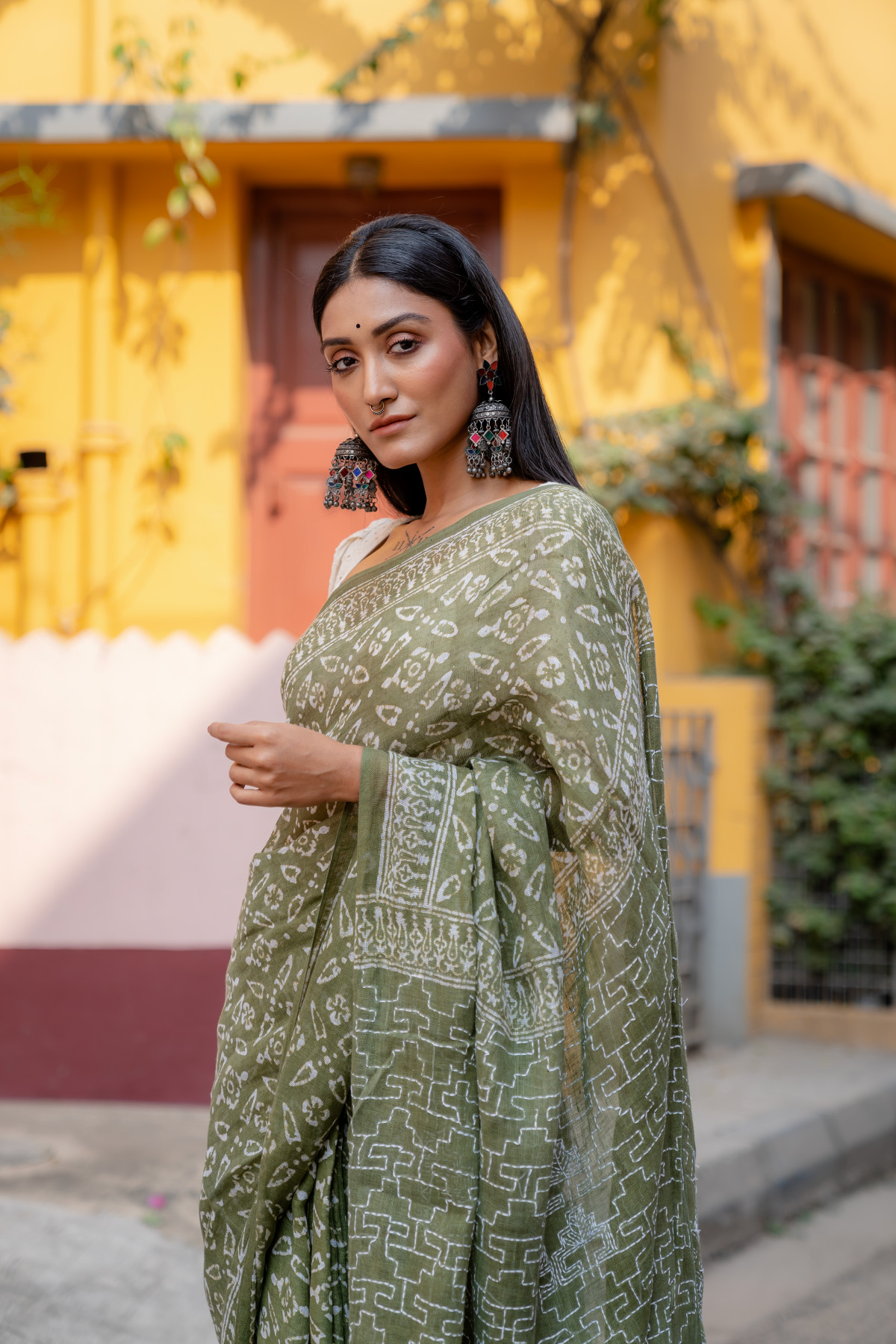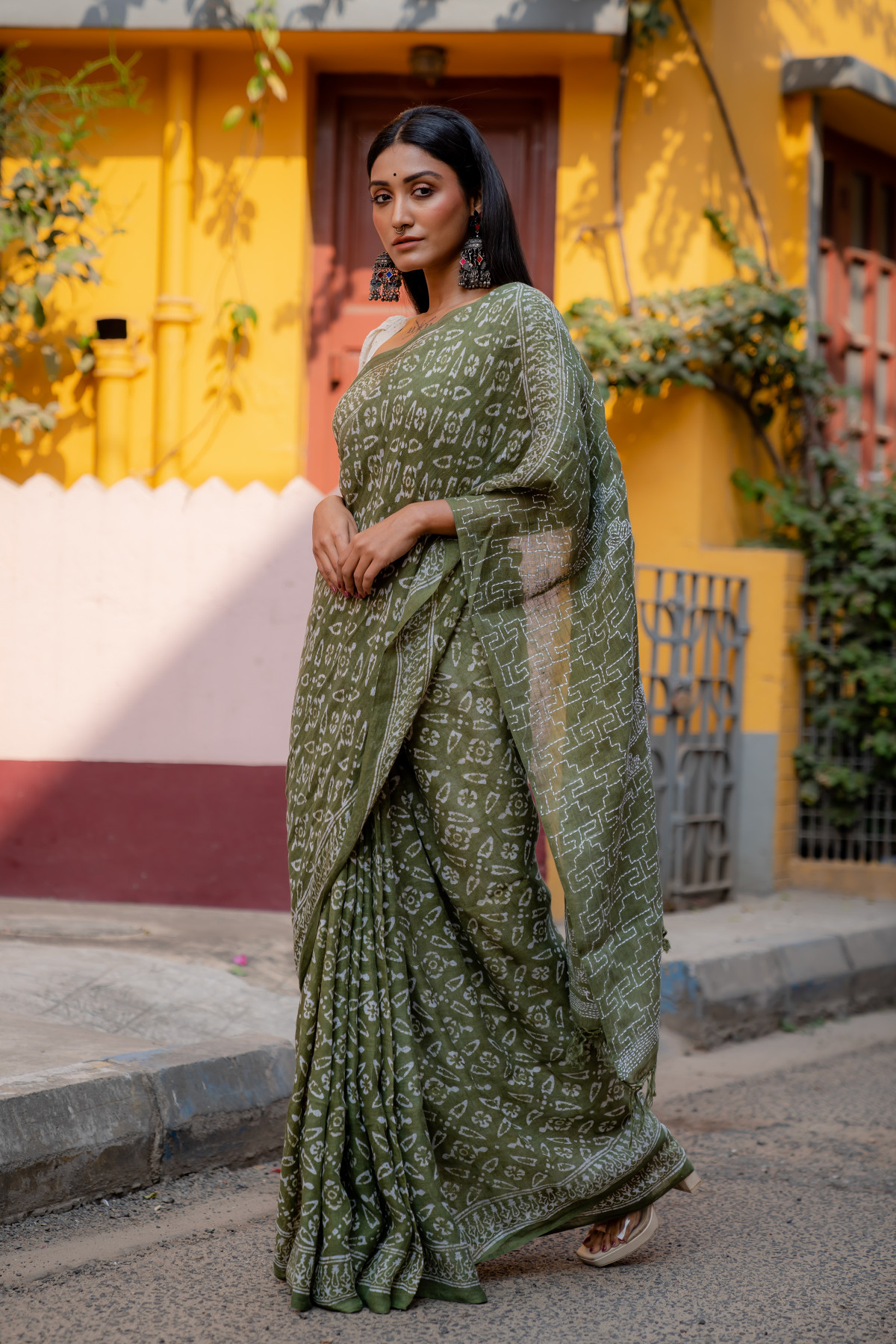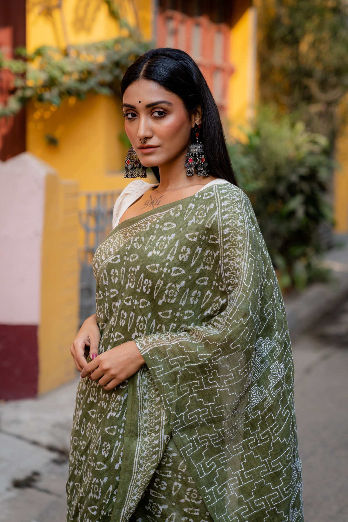 Daymanti stood gracefully in the softly lit studio, draped in a stunning Pista Green batik kantha linen saree from Bandhuli’s unique collection. The intricate hand-stitched patterns and delicate batik designs told stories of tradition and craftsmanship, making the saree a true masterpiece. The subtle sheen of the linen fabric added elegance to her poised figure, while the contrasting white stitches on the dark canvas created a mesmerizing effect.