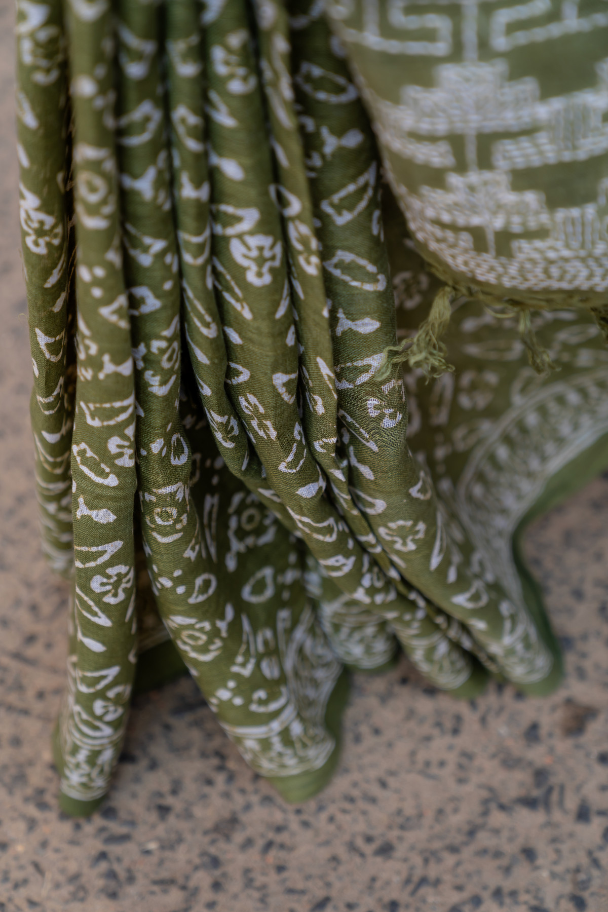 After the Batik process, the fabric travels to the serene rural villages of Shantiniketan in West Bengal. Here, the traditional Kantha stitch is meticulously embroidered by the dexterous hands of local women artisans. Kantha embroidery involves running stitches to create intricate patterns and narratives, often inspired by nature, folklore, and everyday life. The repetitive and meditative stitching technique adds texture and depth to the saree, transforming it into a piece of art.