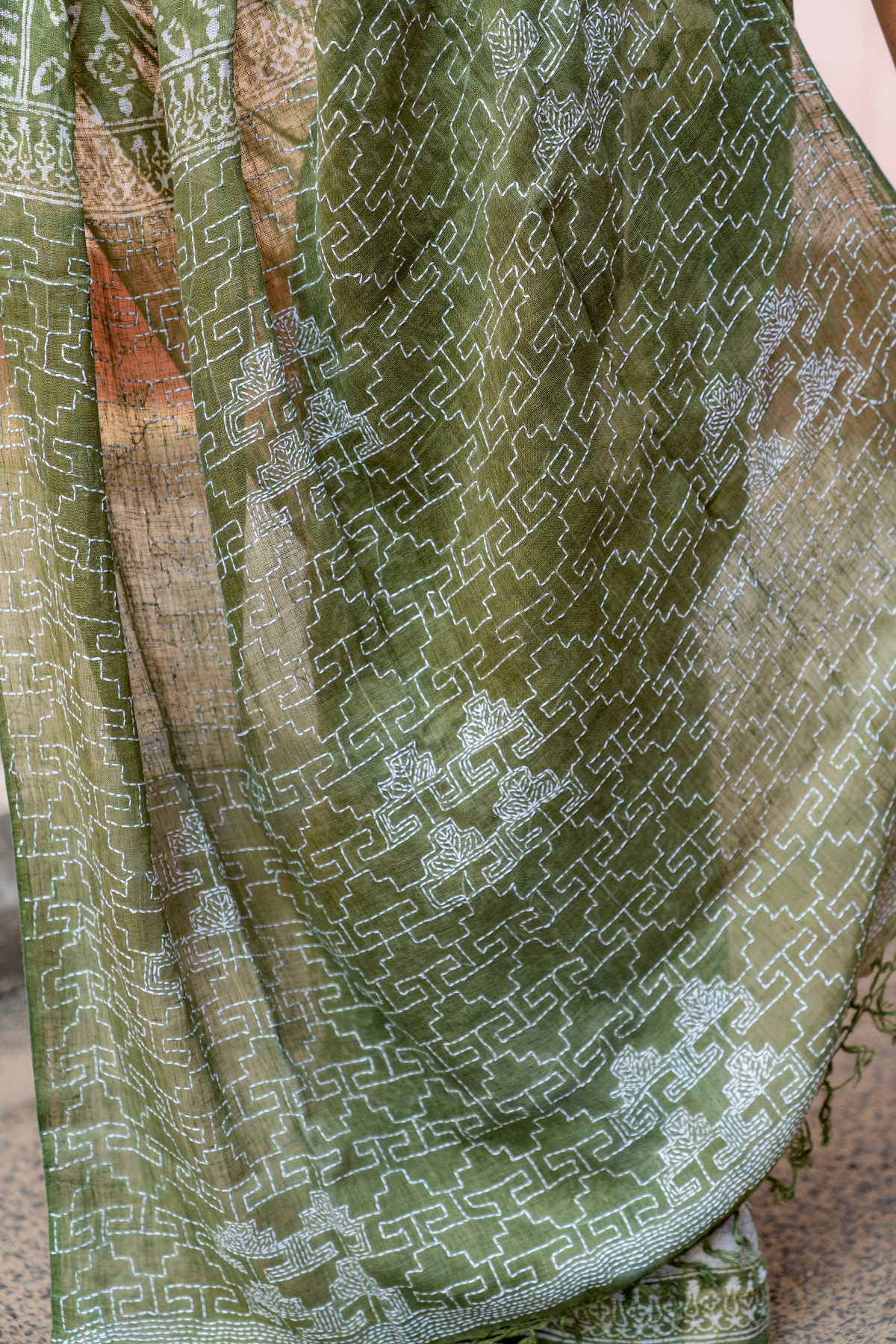Pista Green Batik Kantha Linen Saree - BBS145