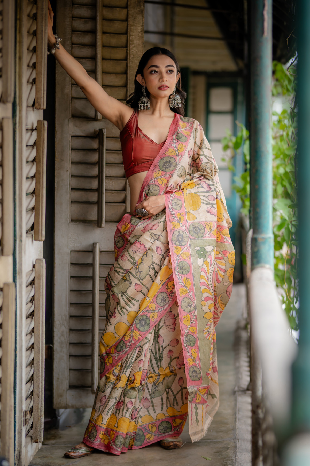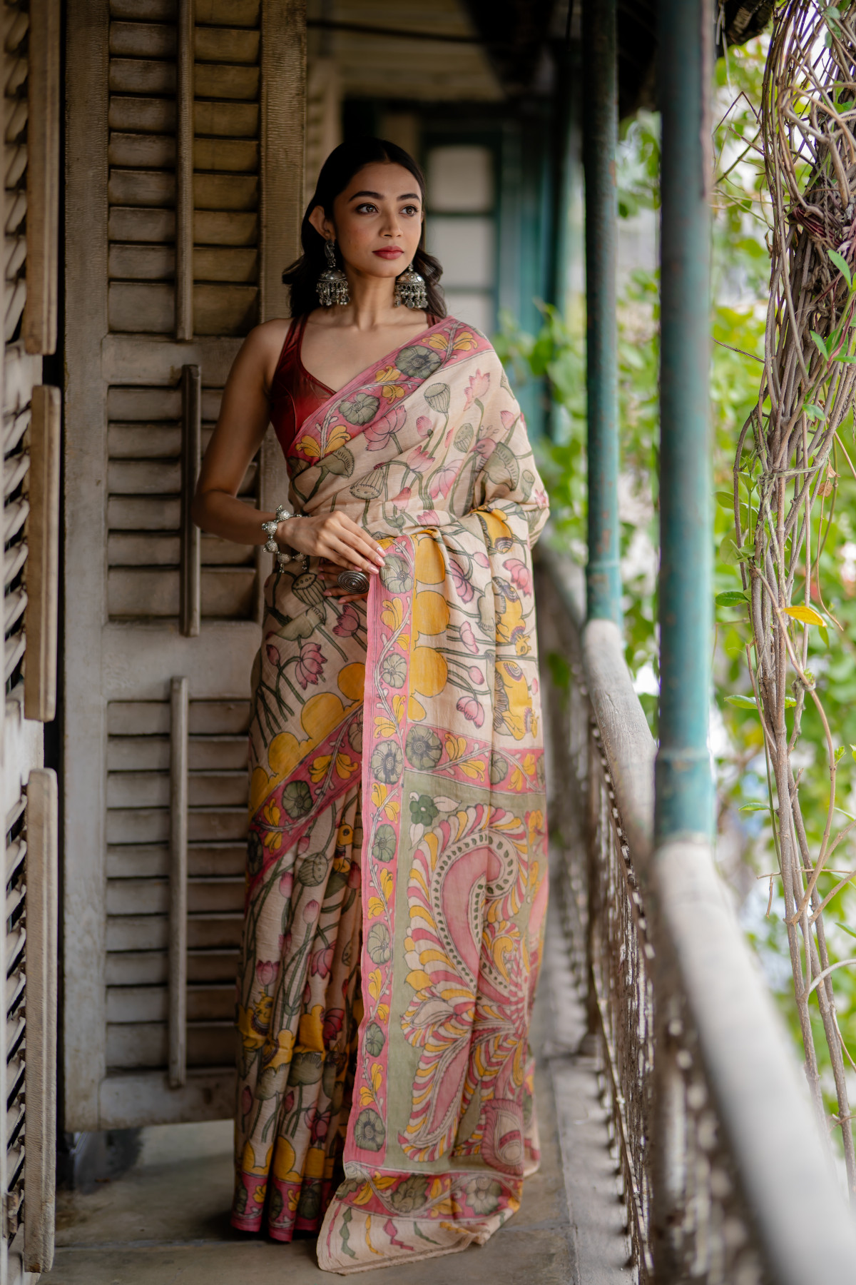 Like an artist wielding an arcane brush, Kalamkari craftsmen embark on their artistic pilgrimage, harnessing nature's palette to breathe life into the fabric. With utmost precision, they yield a slender bamboo or date palm stick, saturated with hues derived from earth's bountiful offerings – plants, minerals, and the humble cow's blessed bounty. The saree's canvas becomes a realm of infinite possibilities, awaiting the touch of their nimble hands.
