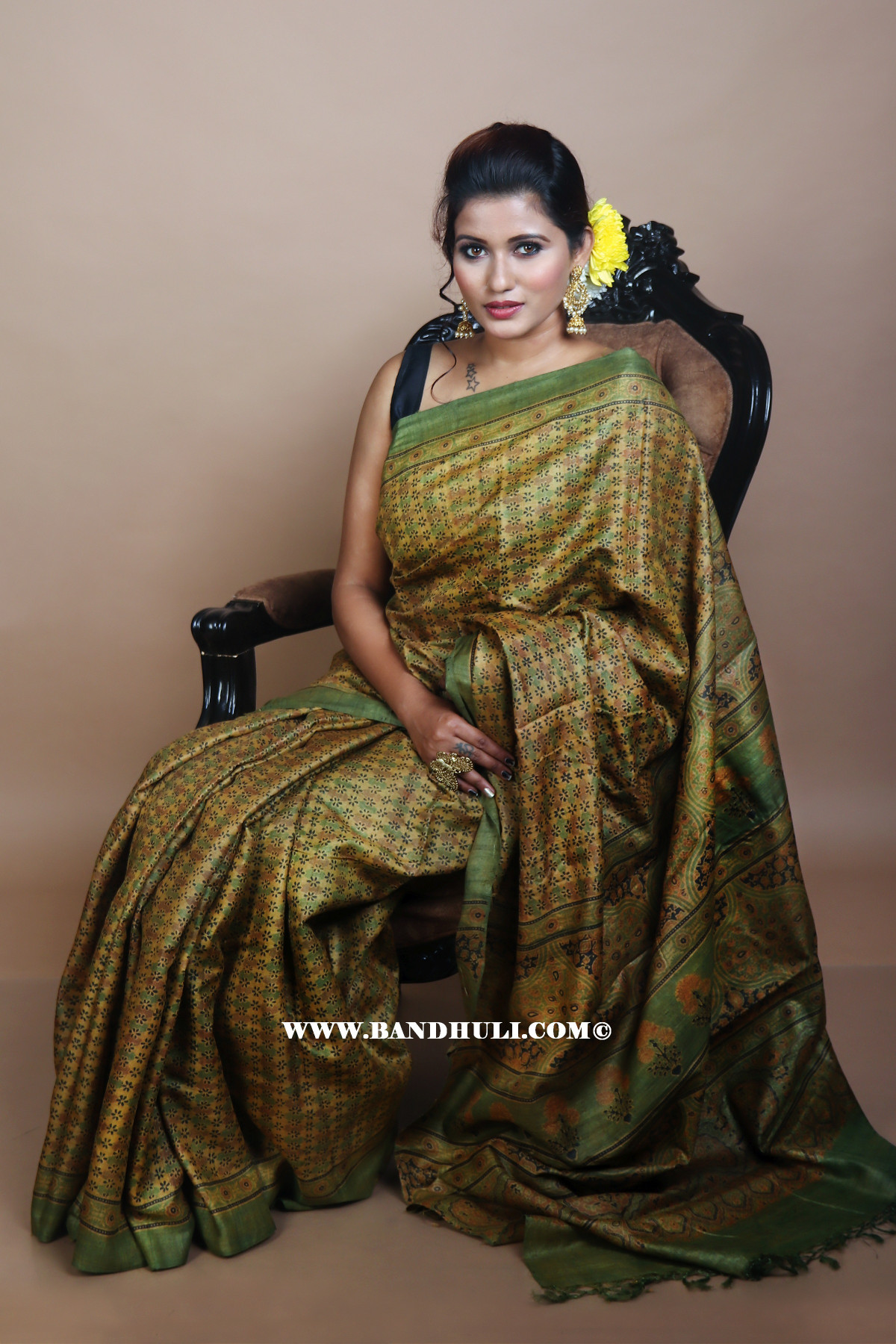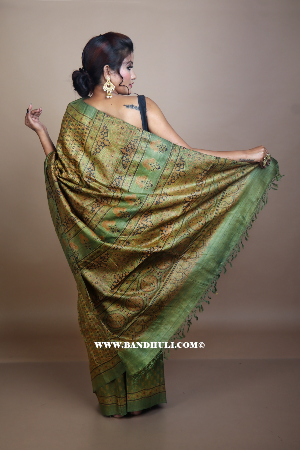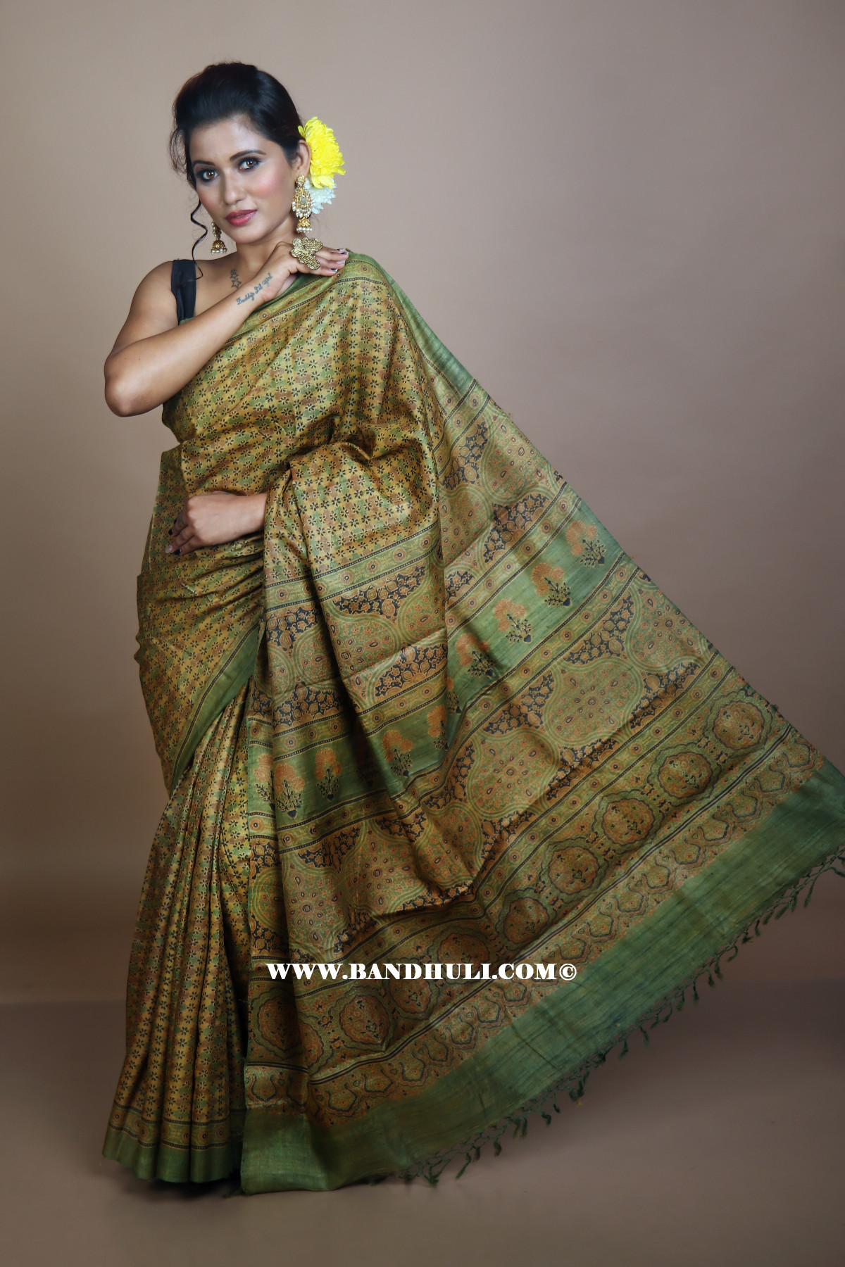 Tania stood gracefully in the softly lit studio, draped in the exquisite Sap Green Color Floral and Geometrical Pattern Tussar Ajrakh Hand Block Saree from Bandhuli's collection. The intricate designs of the saree, blending traditional craftsmanship with modern elegance, perfectly complemented her poised demeanor. The subtle sheen of the Tussar silk reflected the light, enhancing the vibrancy of the Ajrakh motifs.