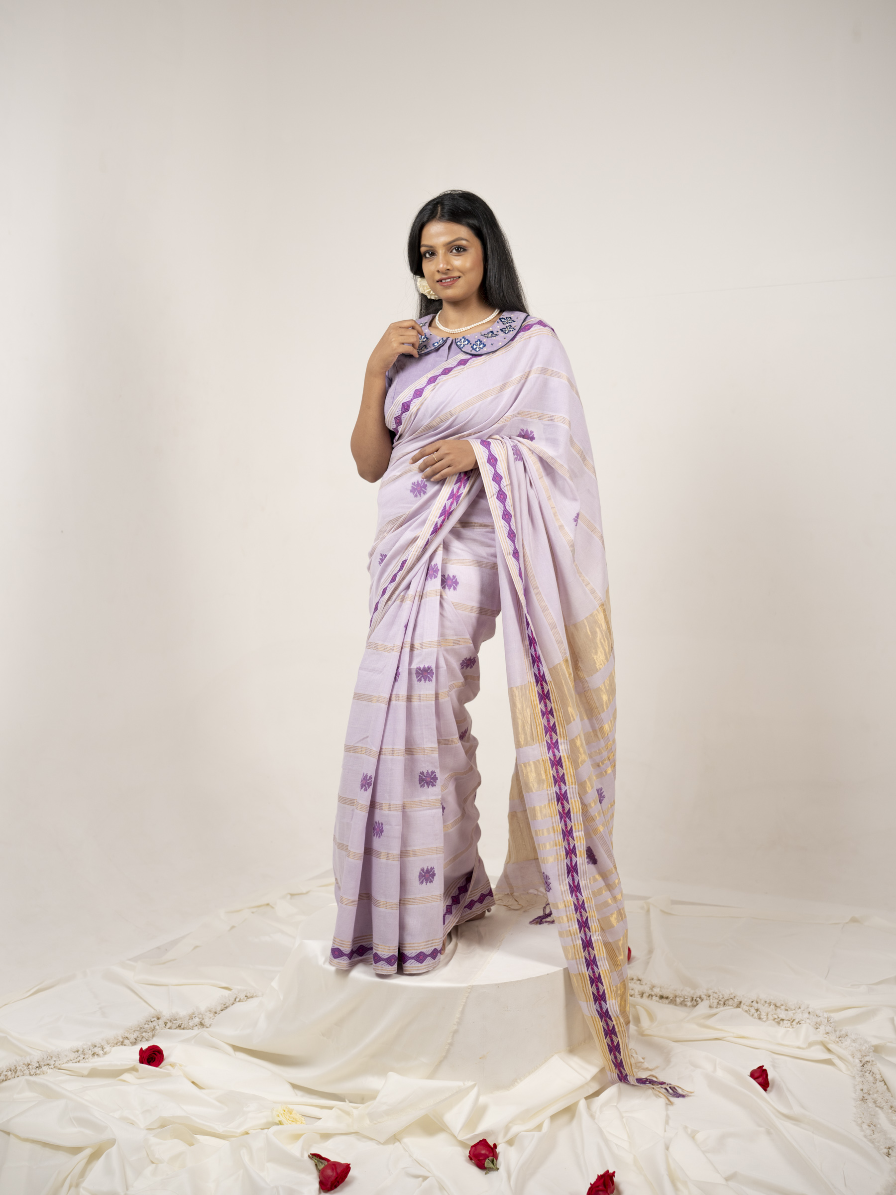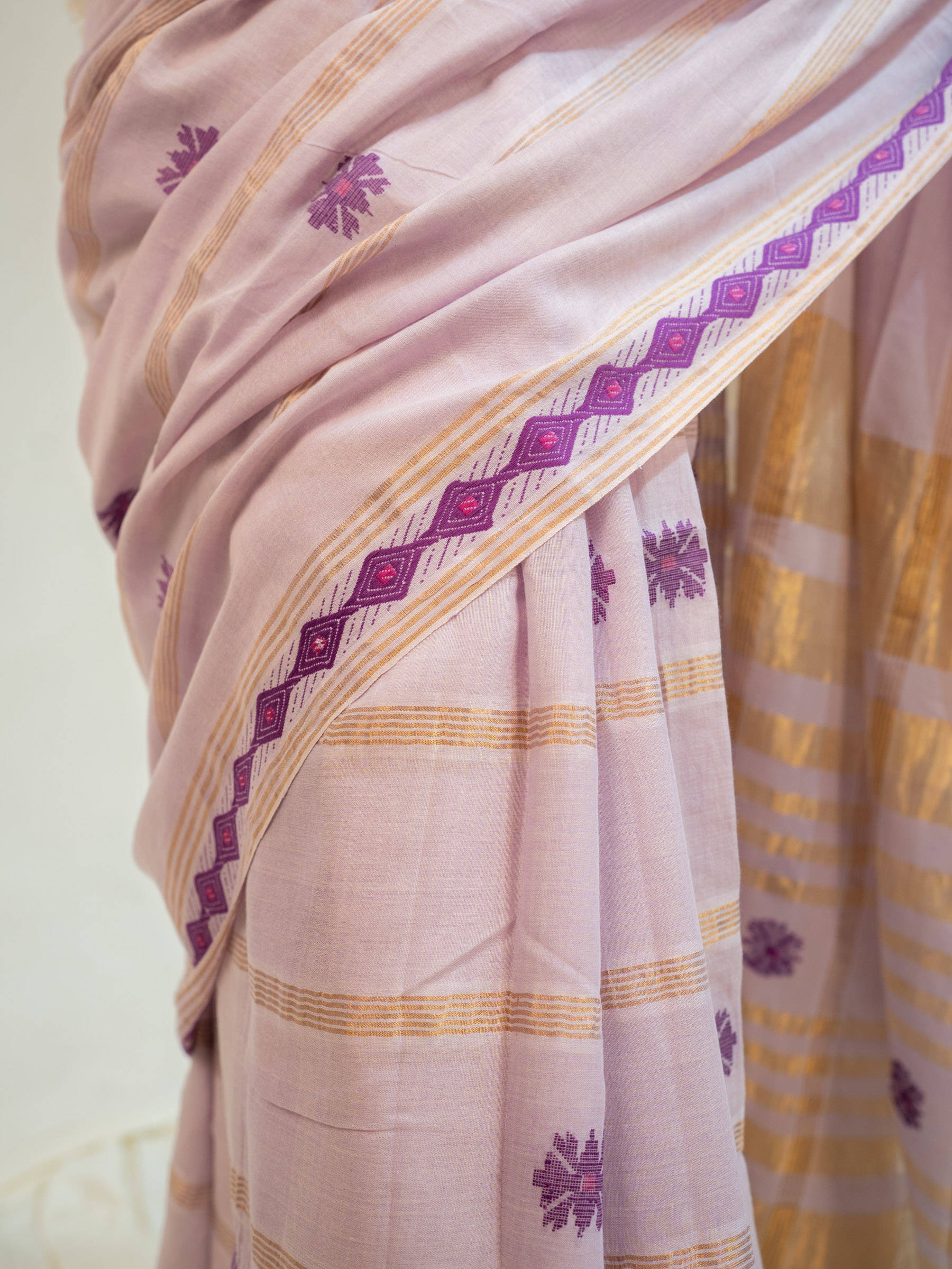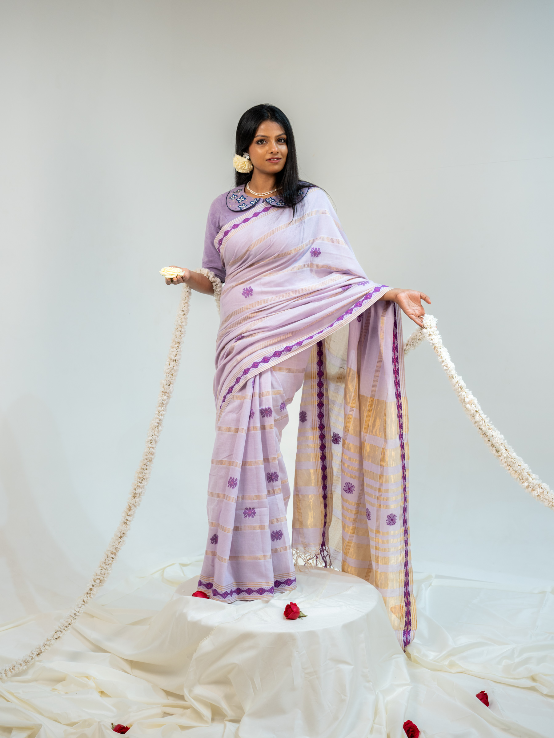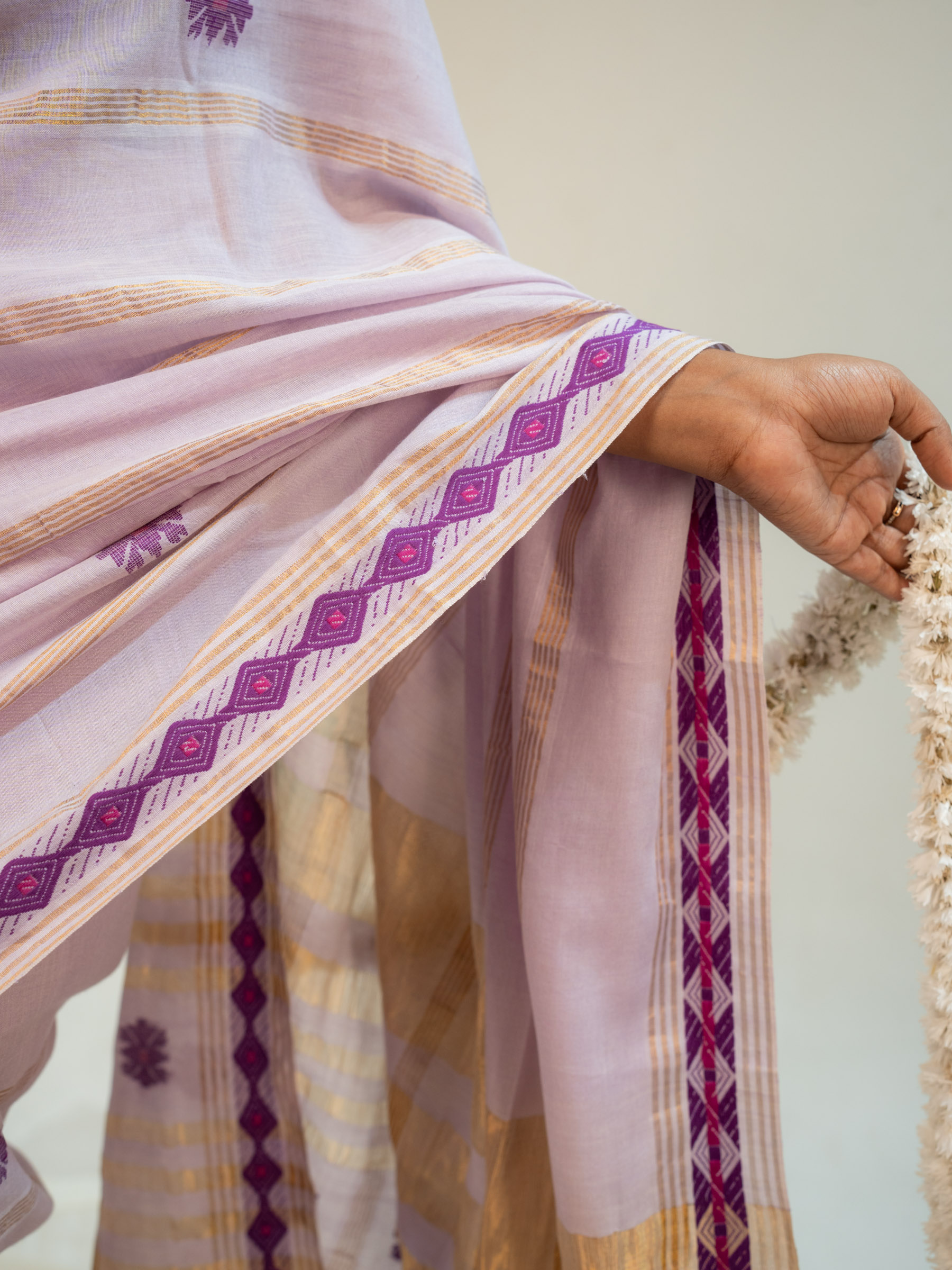 The Jamini saree is a soft and elegant expression of grace, crafted in light and breathable hand spun cotton and bamboo cotton. Set in a soothing lavender base, it features traditional geometric Jamdani motifs in rich purple, creating a delicate yet striking contrast. The motif name is Sondesh phool which is referred from traditional jamdani references.