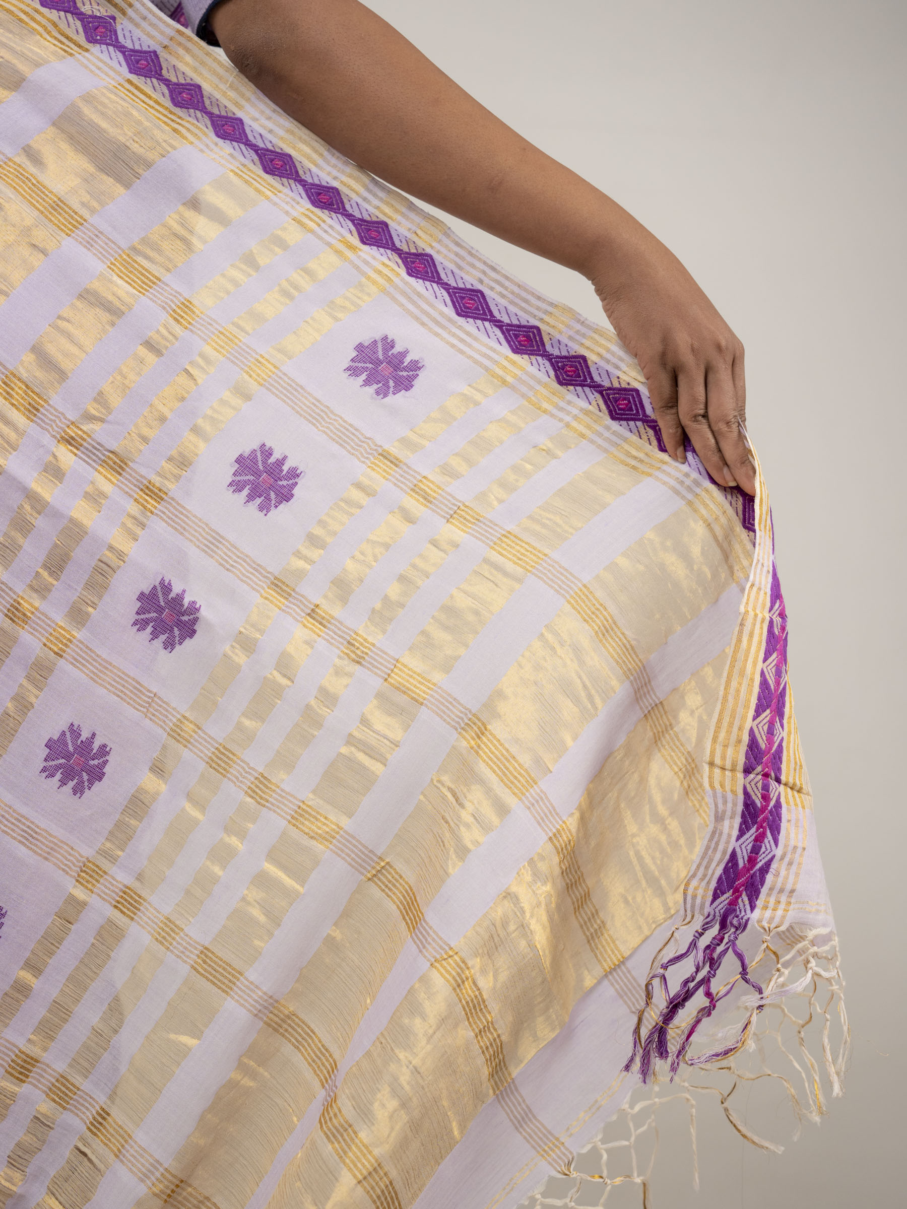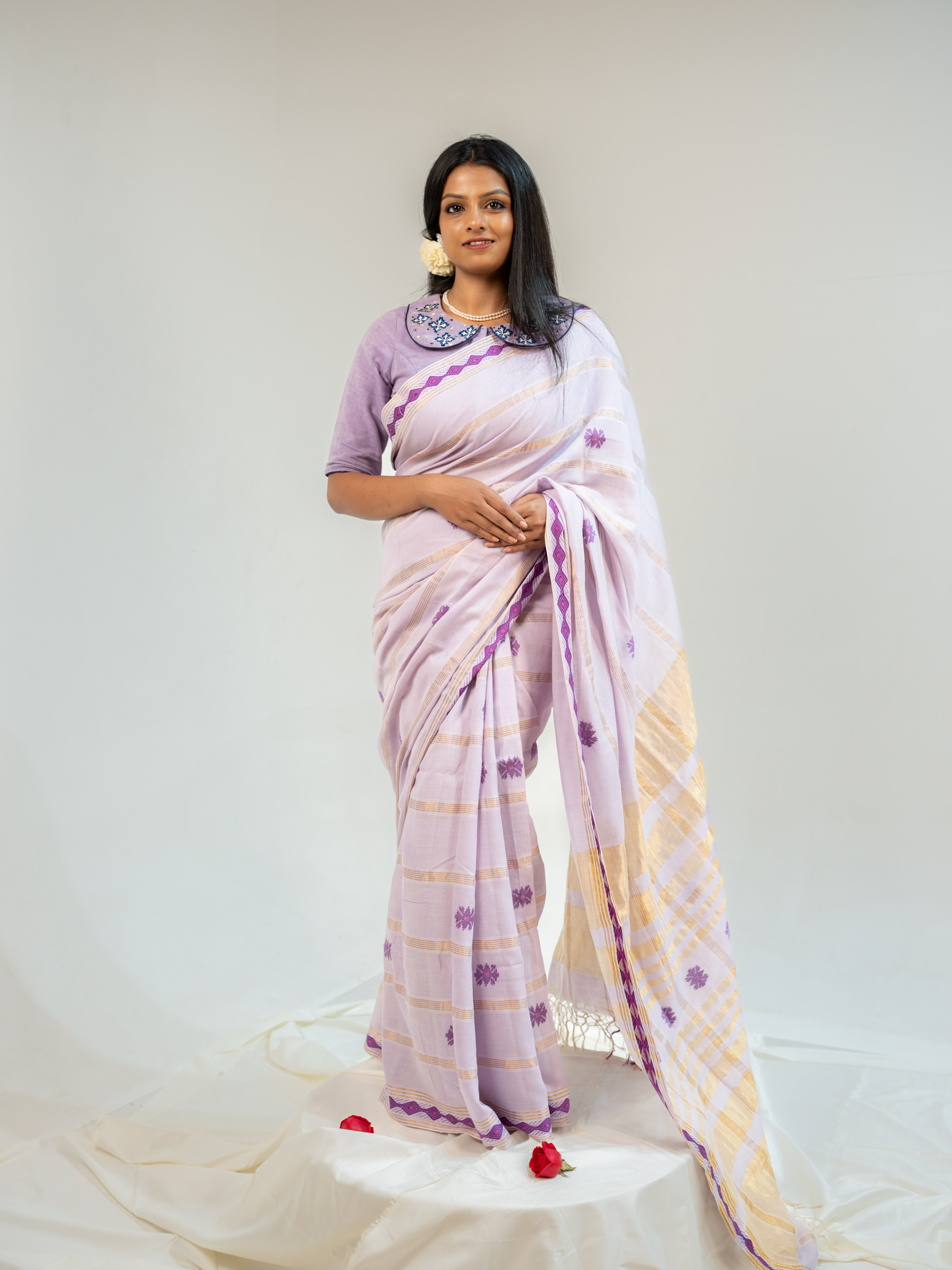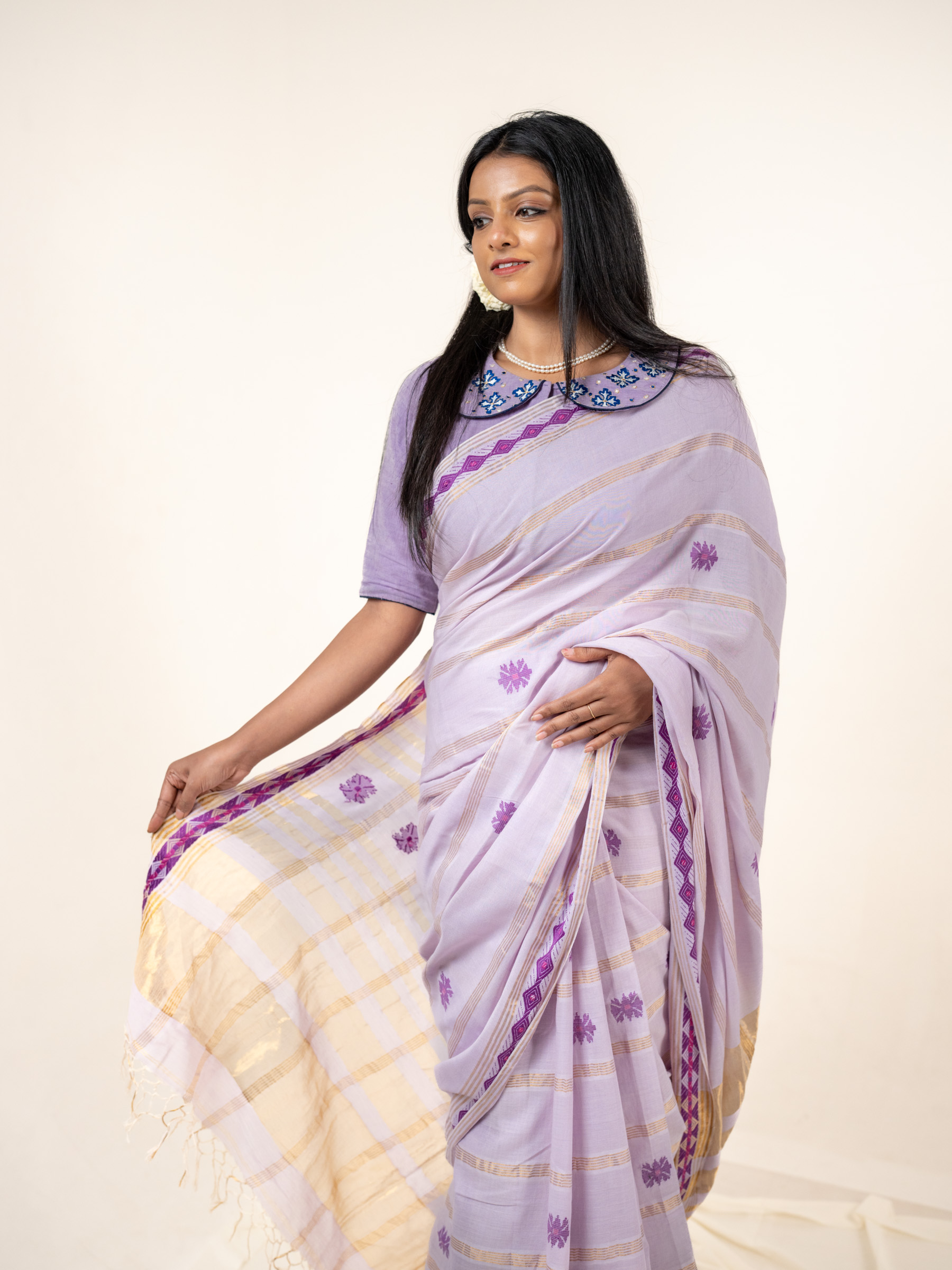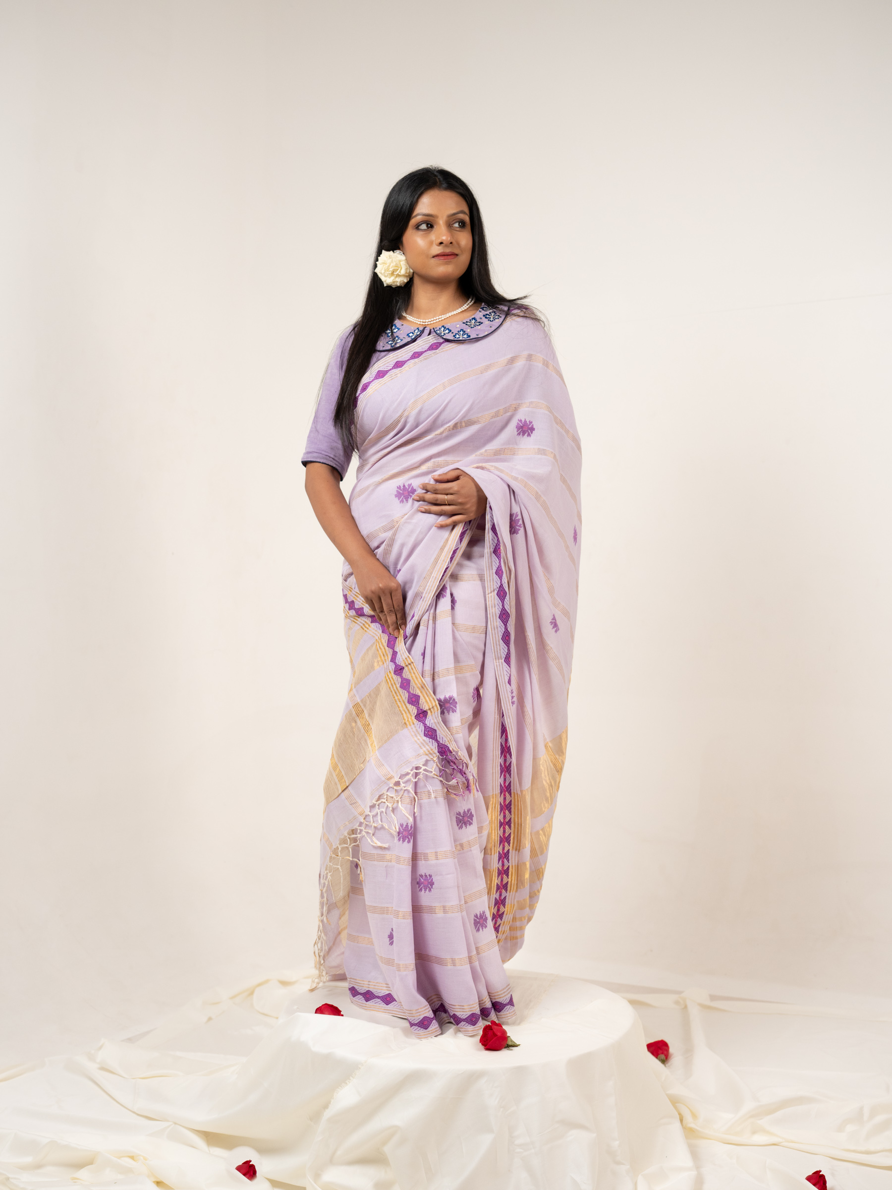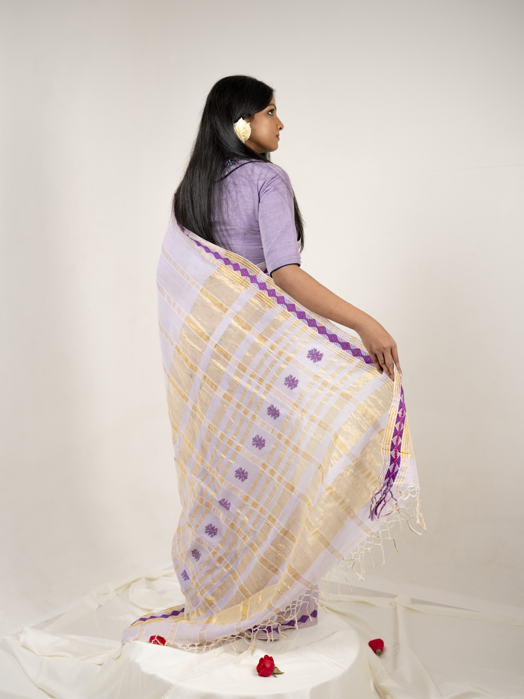The Jamini saree is a soft and elegant expression of grace, crafted in light and breathable hand spun cotton and bamboo cotton. Set in a soothing lavender base, it features traditional geometric Jamdani motifs in rich purple, creating a delicate yet striking contrast. The motif name is Sondesh phool which is referred from traditional jamdani references.