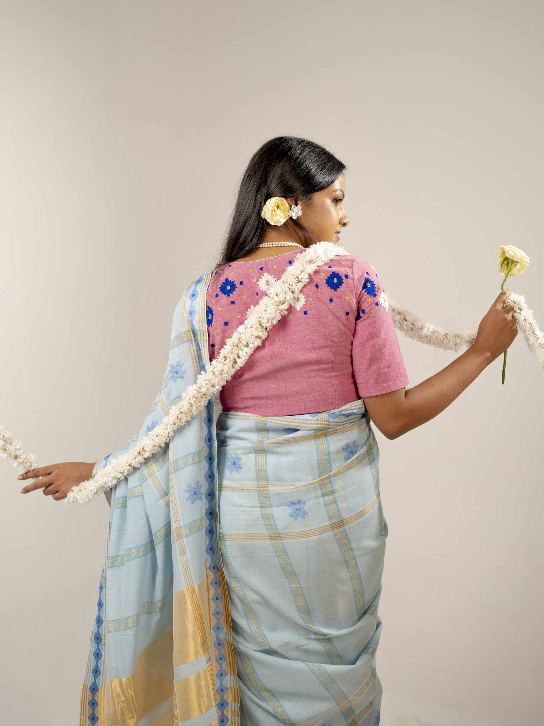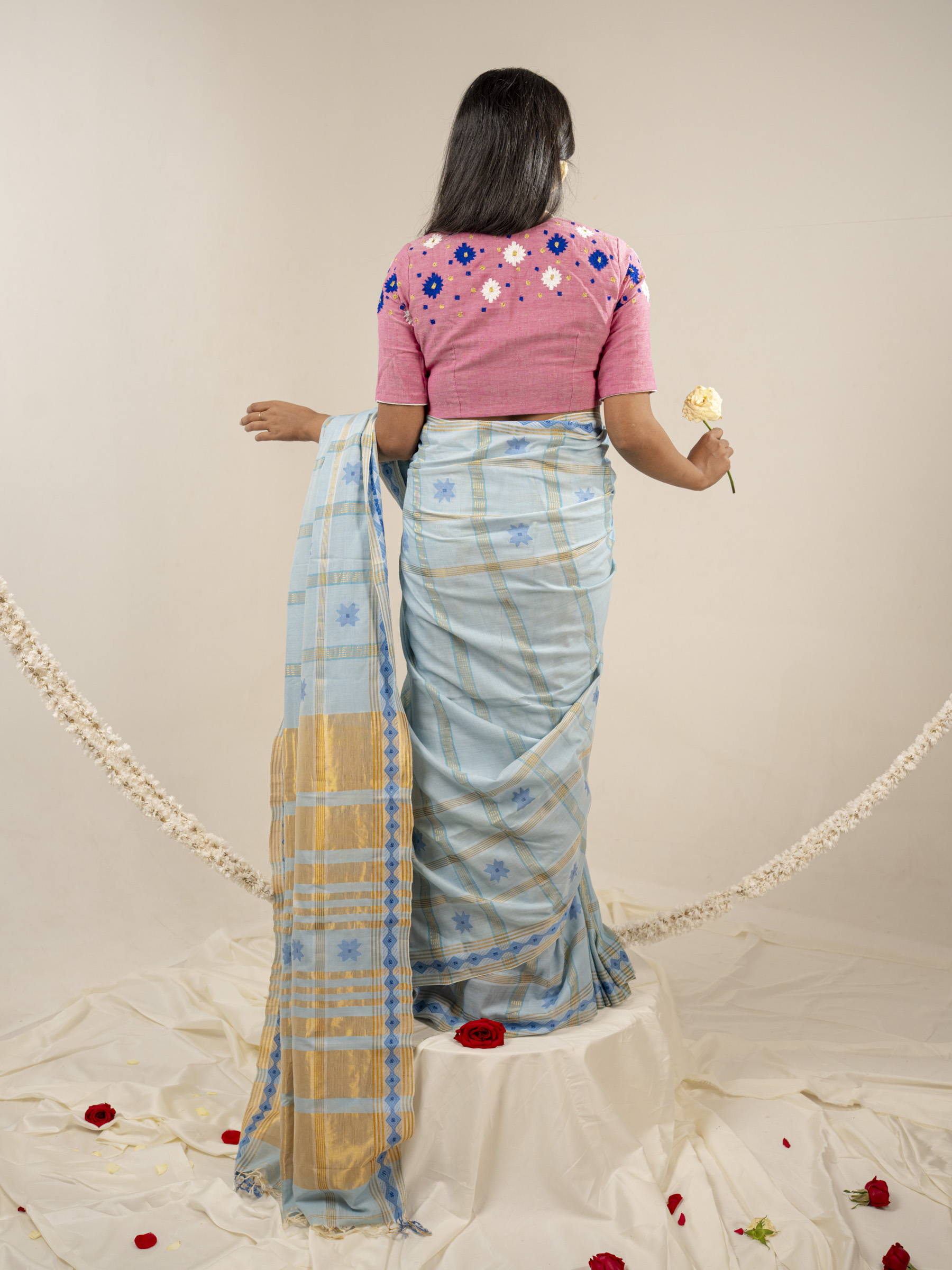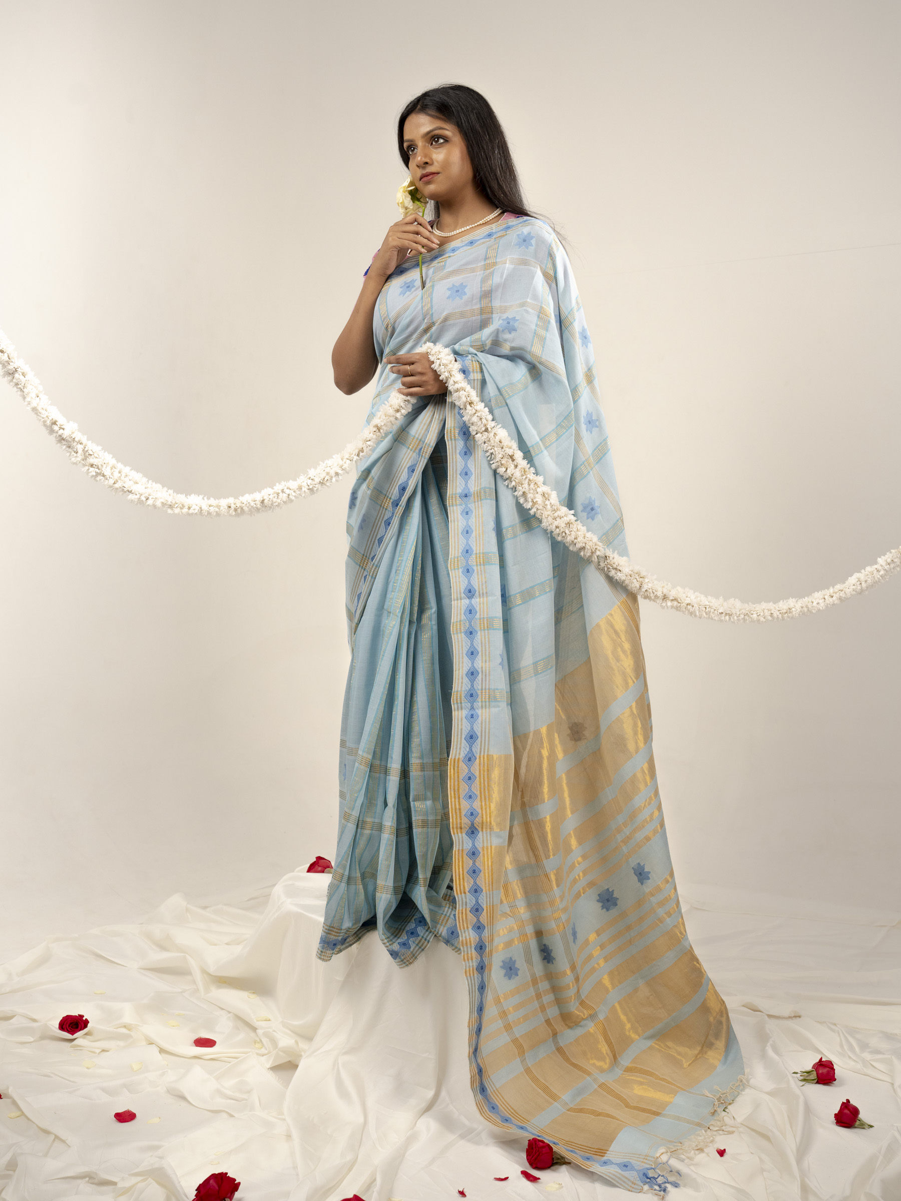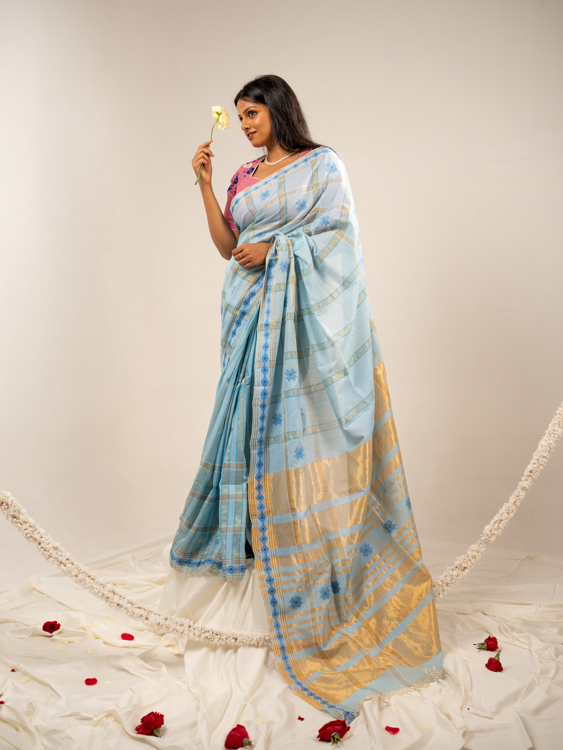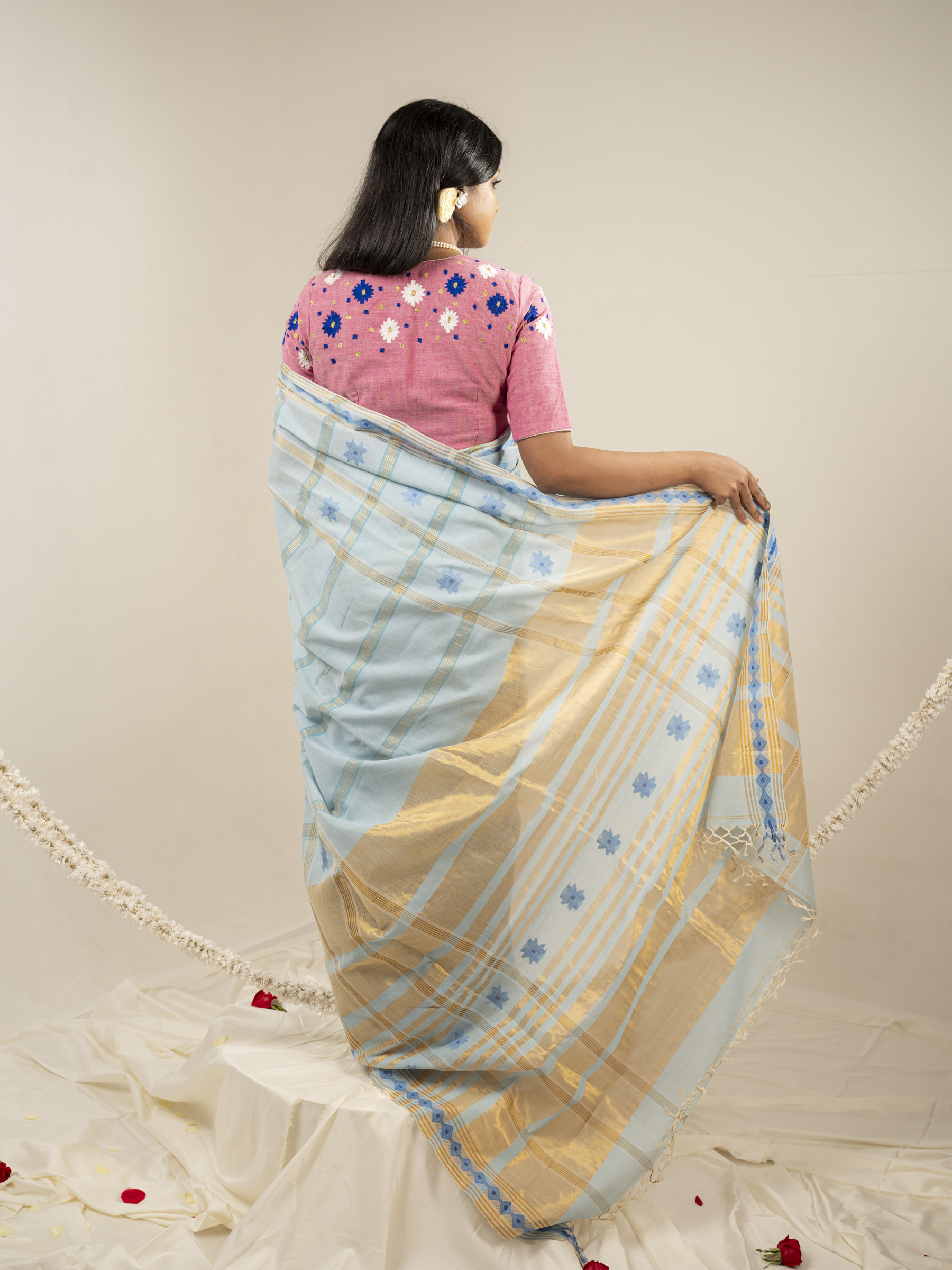 The Neelima saree is a serene and graceful expression of elegance, crafted in soft and breathable hand spun cotton and bamboo cotton. Set in a calming light blue base, it features traditional geometric Jamdani motifs in deep blue, creating a subtle yet striking contrast. The motif name is Tara phool which is referred from traditional jamdani references.