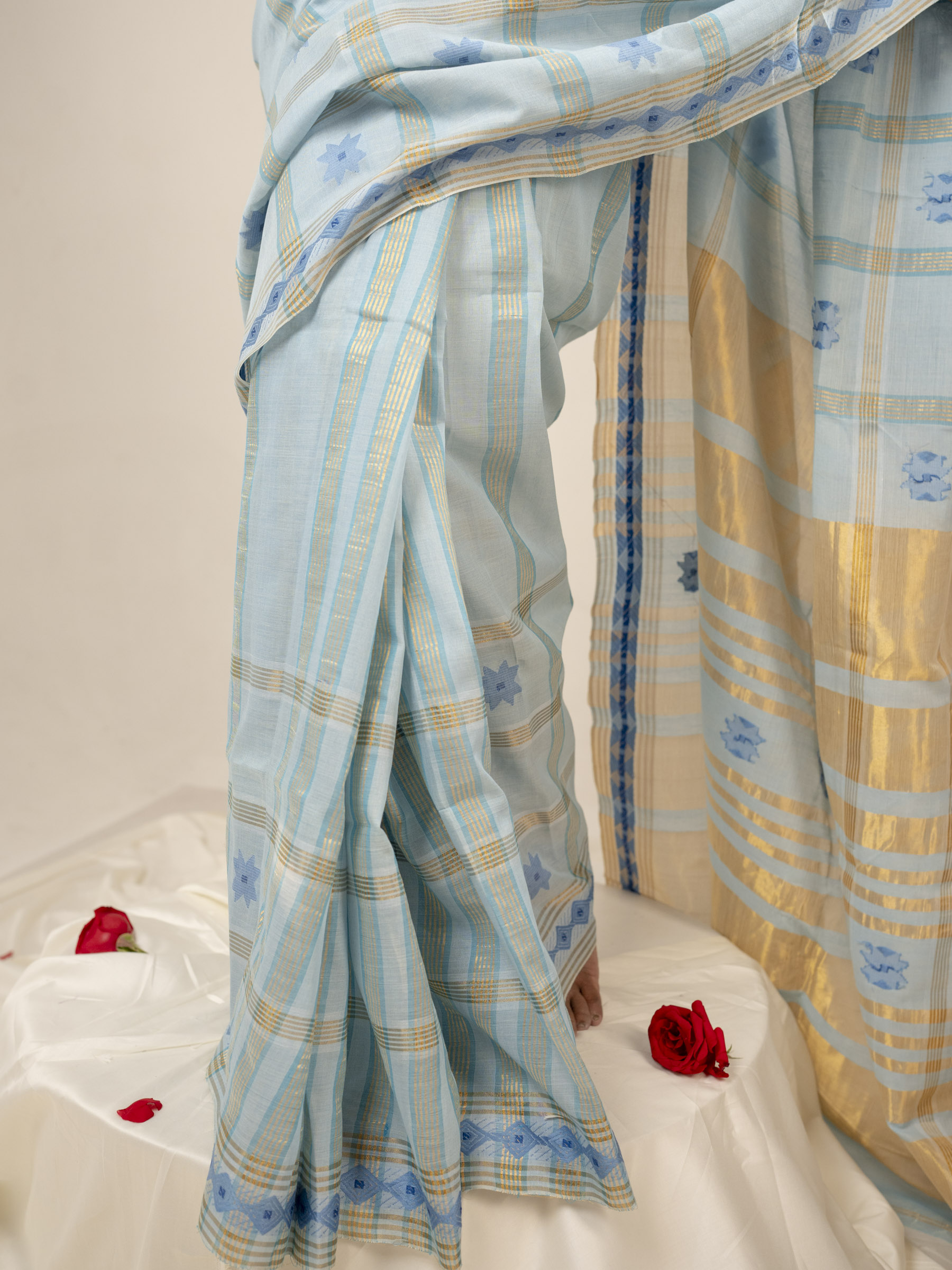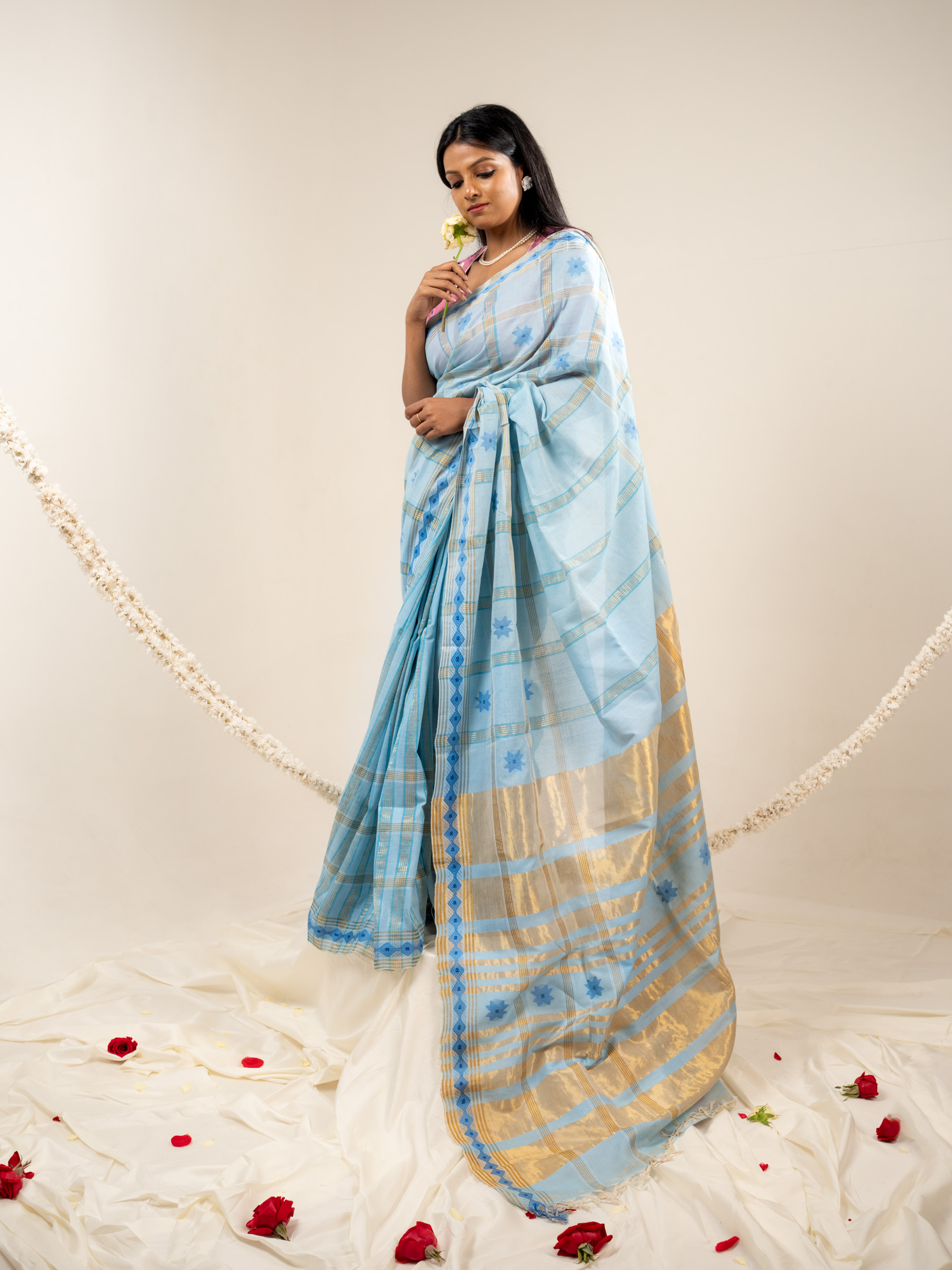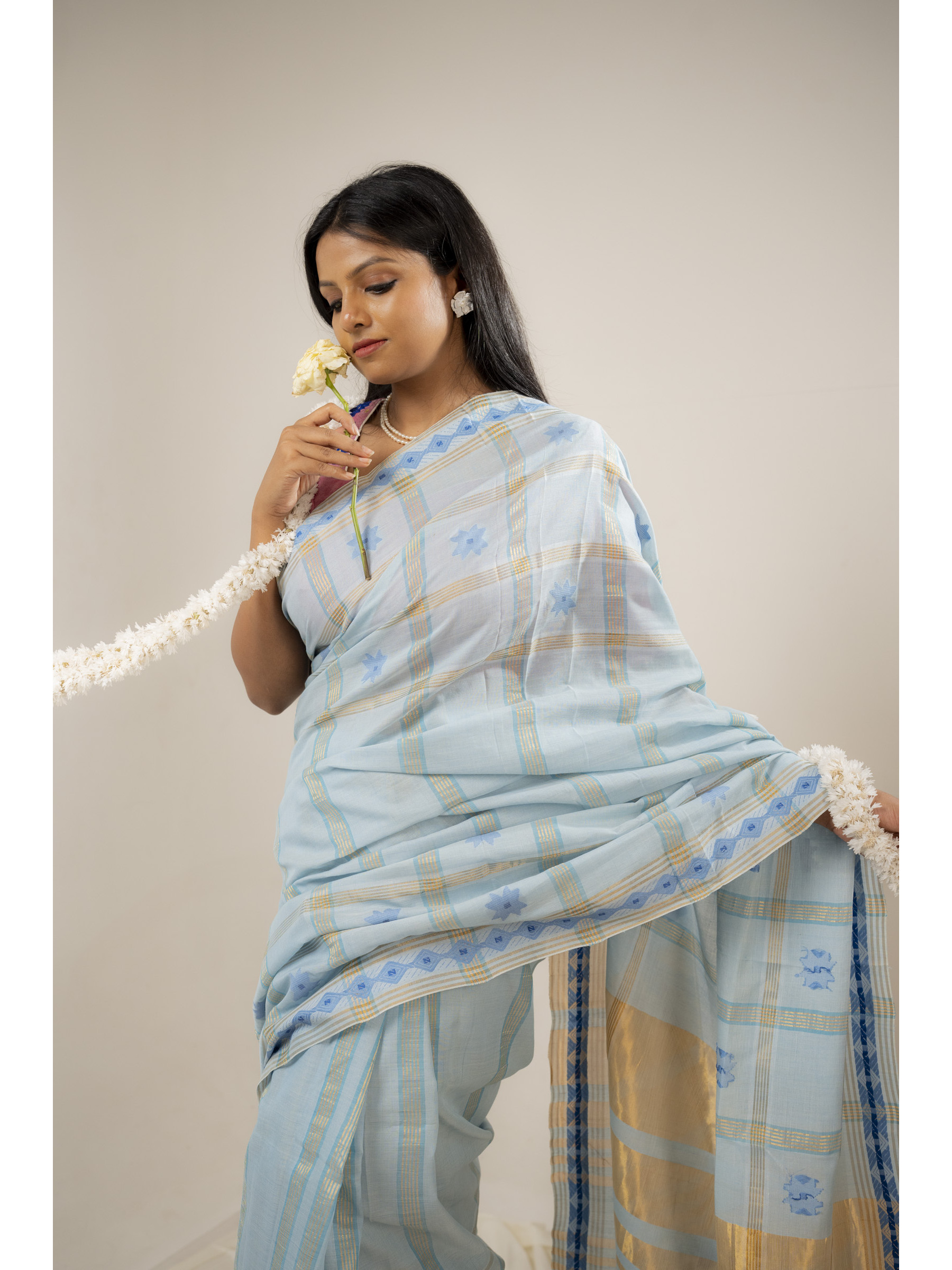 Handwoven Jamdani - Light Blue color Cotton saree with Dark Blue jamdani motif