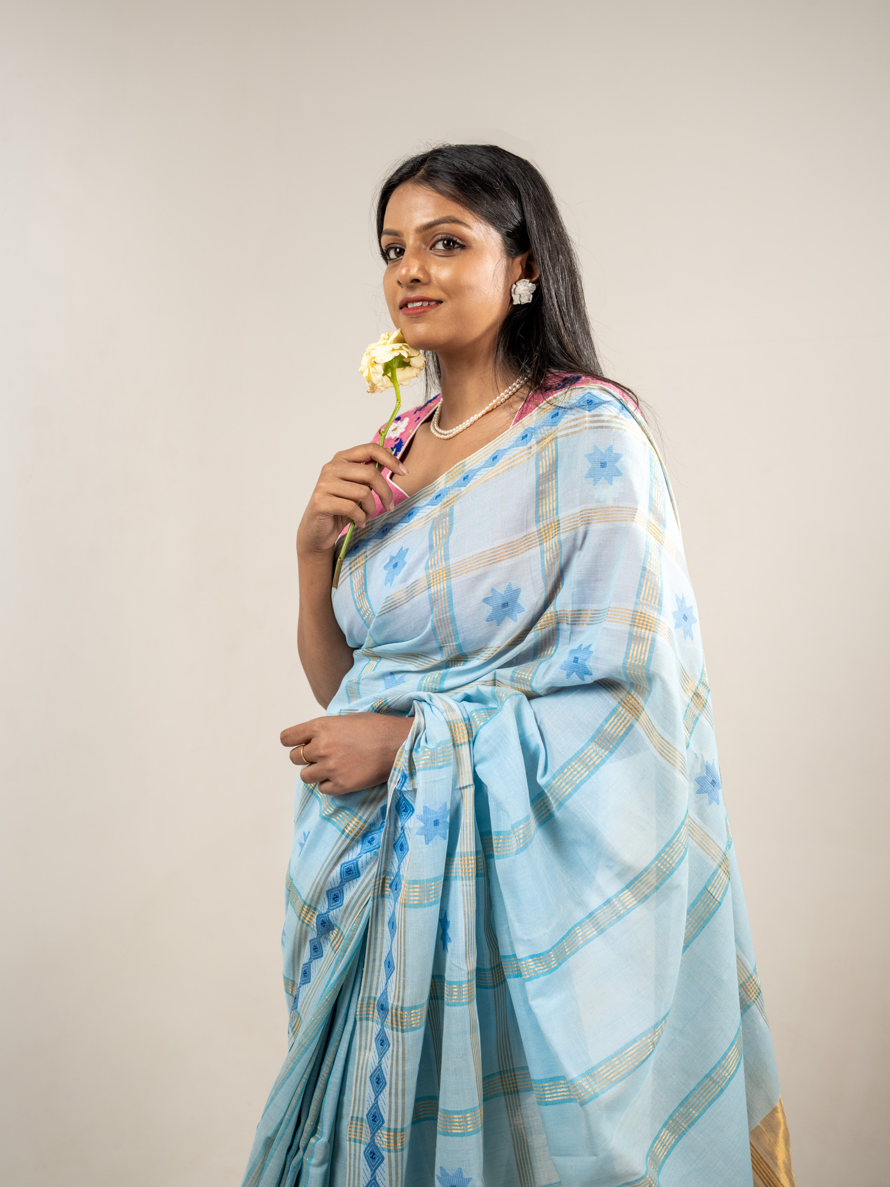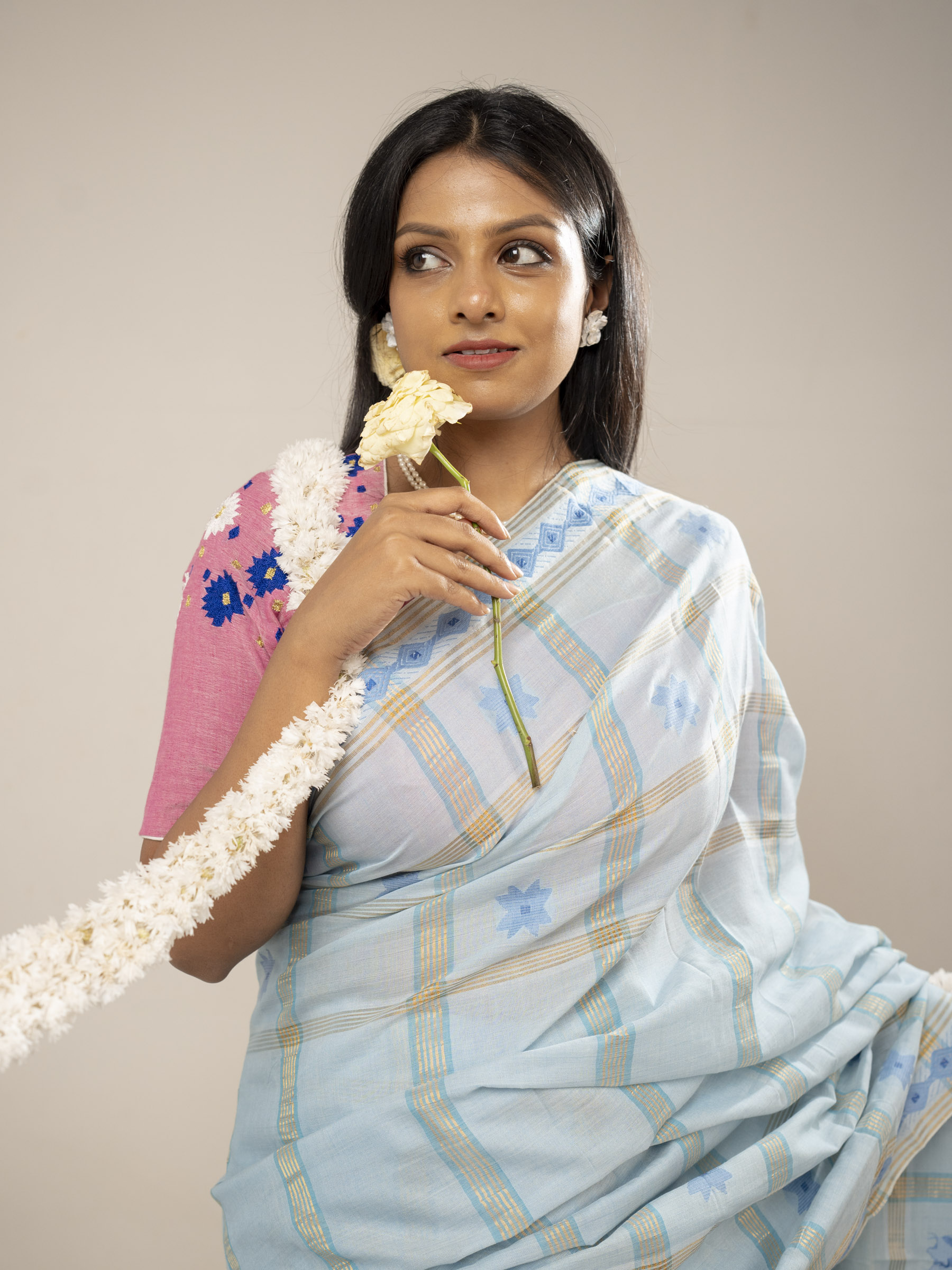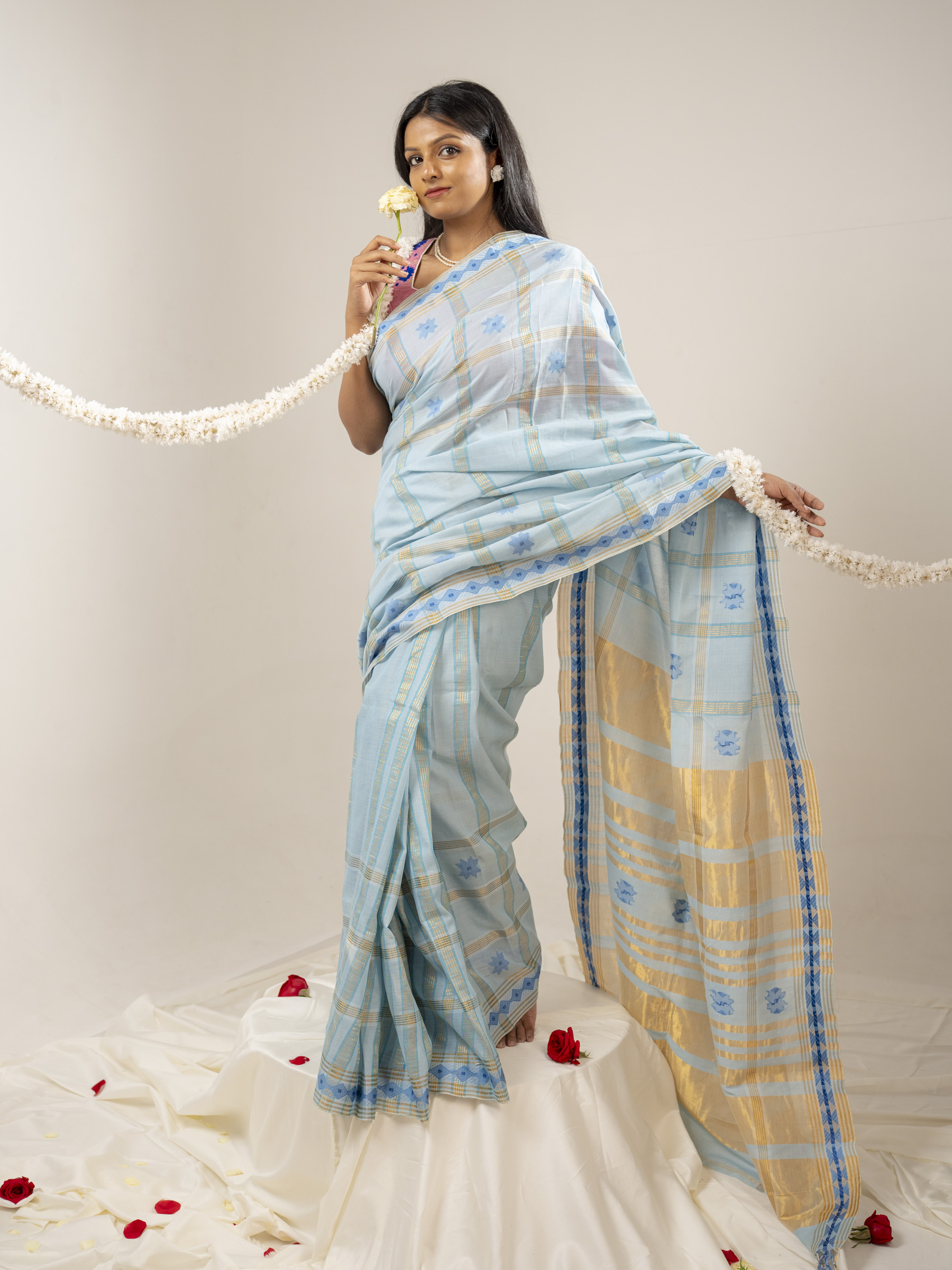 Handwoven Jamdani - Light Blue color Cotton saree with Dark Blue jamdani motif